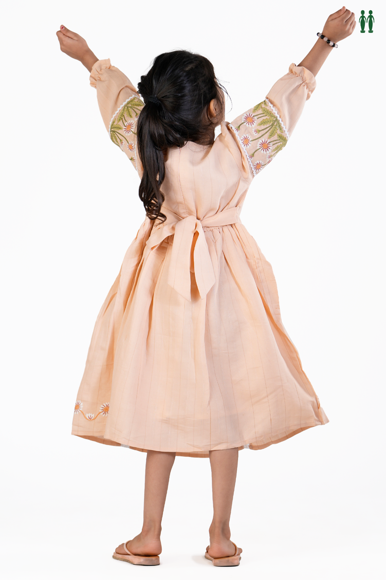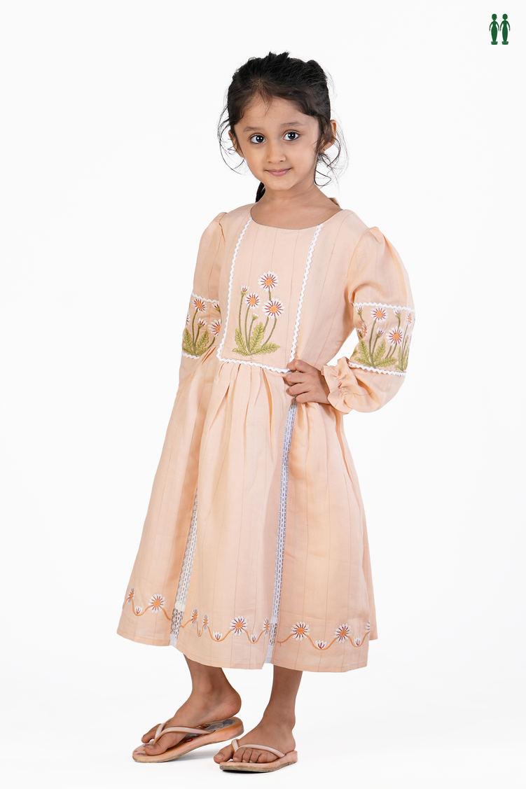 Embrace timeless elegance with this exquisite cotton frock, featuring a graceful round neckline and intricate floral embroidery. The vibrant orange hue radiates warmth and sophistication, while the breathable cotton fabric ensures all-day comfort. Perfect for casual gatherings, festive occasions, or everyday wear, this versatile piece seamlessly transitions from day to evening. The delicate floral design adds a refined touch of artistry, making it an essential addition to any discerning wardrobe.