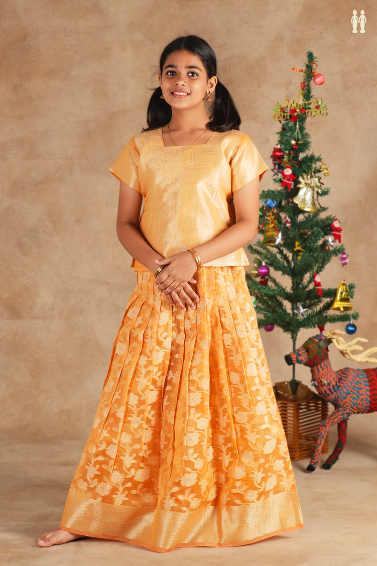 Elevate your child's traditional wardrobe with this exquisite orange kota pavadai sattai, adorned with delicate floral motifs. Crafted from lightweight Kota fabric, this two-piece ensemble offers breathable comfort ideal for festive occasions and celebrations. The intricate floral design adds an elegant touch, while the classic pavadai silhouette ensures timeless appeal. Perfect for temple visits, family gatherings, or cultural events, this piece combines heritage craftsmanship with refined aesthetics.