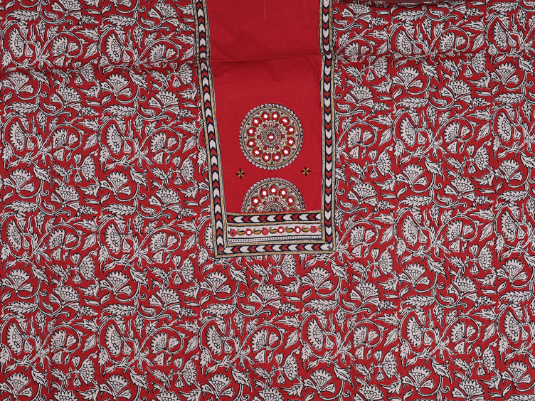 Elevate your ethnic wardrobe with this exquisite red cotton salwar material, adorned with delicate floral motifs. Crafted from premium chanderi fabric, known for its lightweight drape and subtle sheen, this unstitched material offers the perfect canvas for custom tailoring. The rich red hue paired with intricate floral patterns creates a timeless aesthetic ideal for festive occasions and everyday elegance.