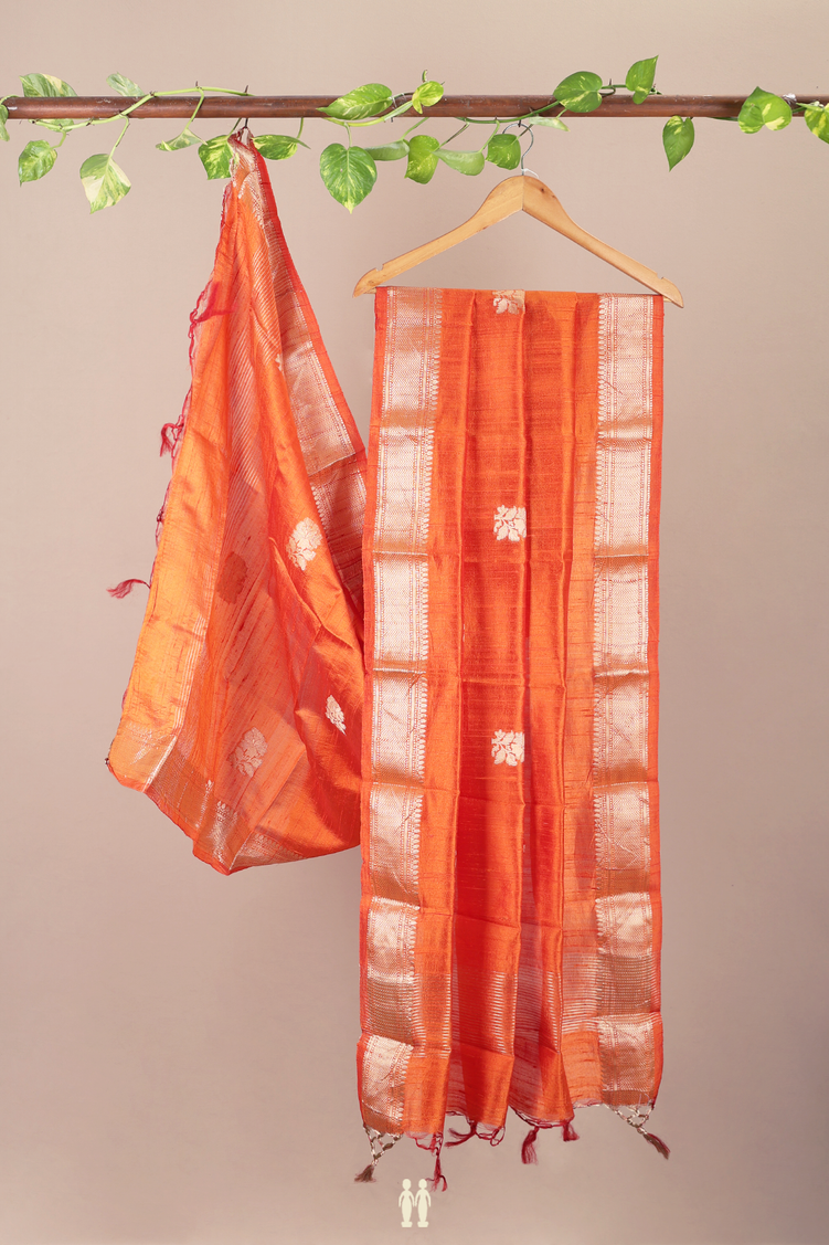Elevate your ensemble with this exquisite floral motifs orange raw silk dupatta. Crafted from rich raw silk, its vibrant orange hue paired with delicate floral motifs adds a refined touch of elegance. Perfect for both traditional occasions and contemporary styles, this dupatta offers a luxurious texture and graceful drape that enhances any outfit with understated sophistication.