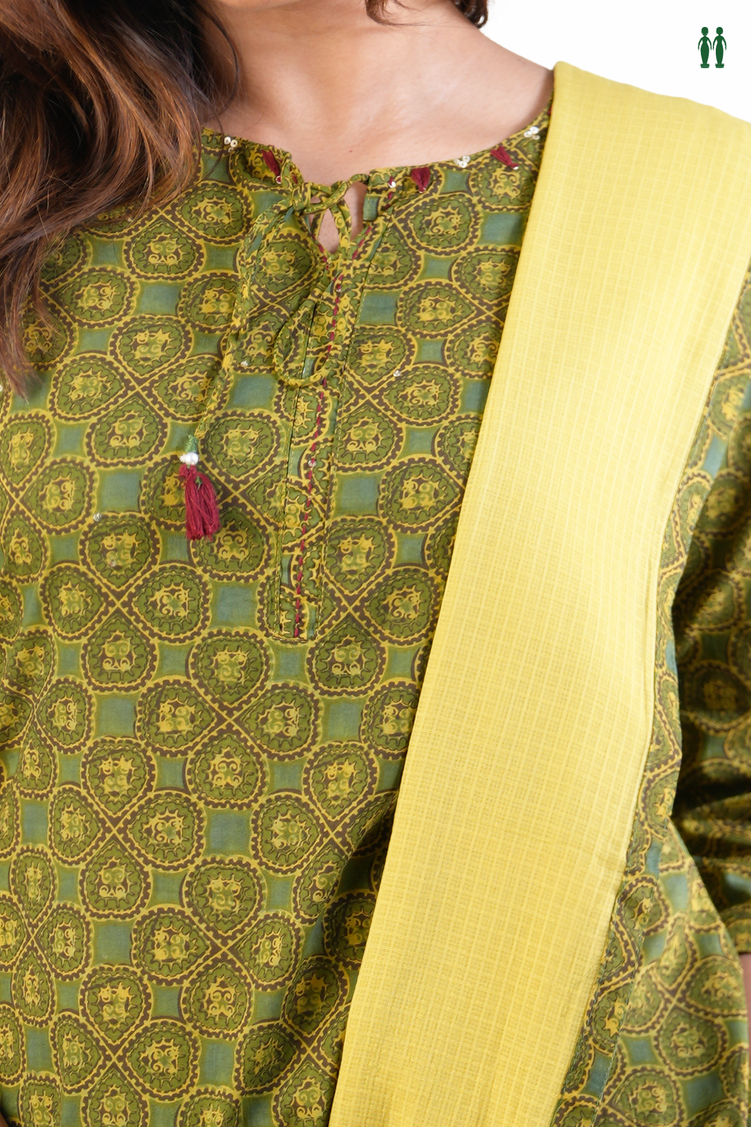 Experience effortless elegance with this front tie up printed design green cotton salwar set. Crafted from breathable cotton, it ensures comfort while showcasing a subtle printed pattern that complements the rich green hue. The front tie-up detail adds a refined touch, blending traditional charm with contemporary style. Perfect for both casual and festive occasions, this set offers a graceful silhouette and easy wearability for a polished look.