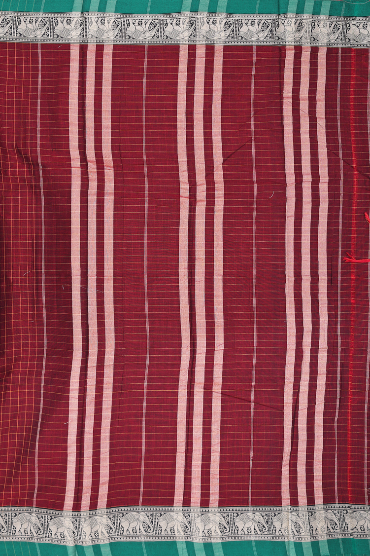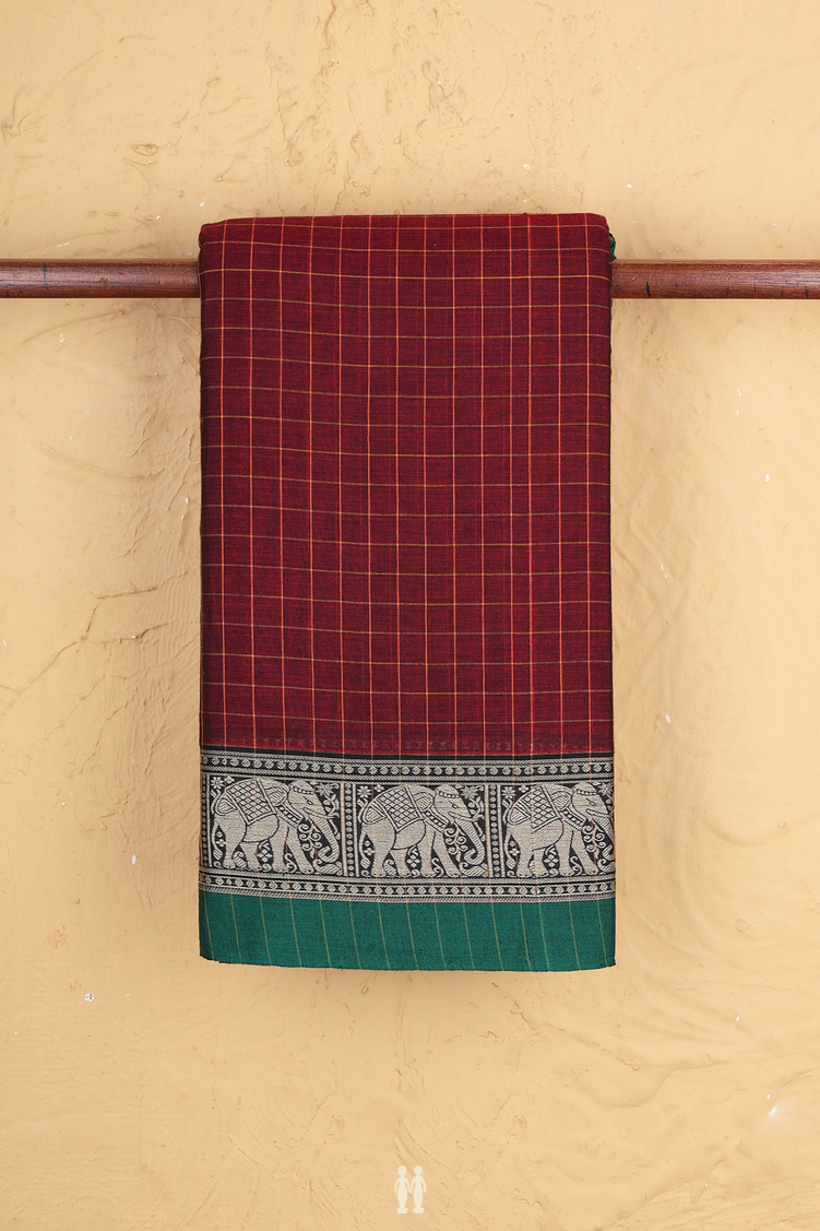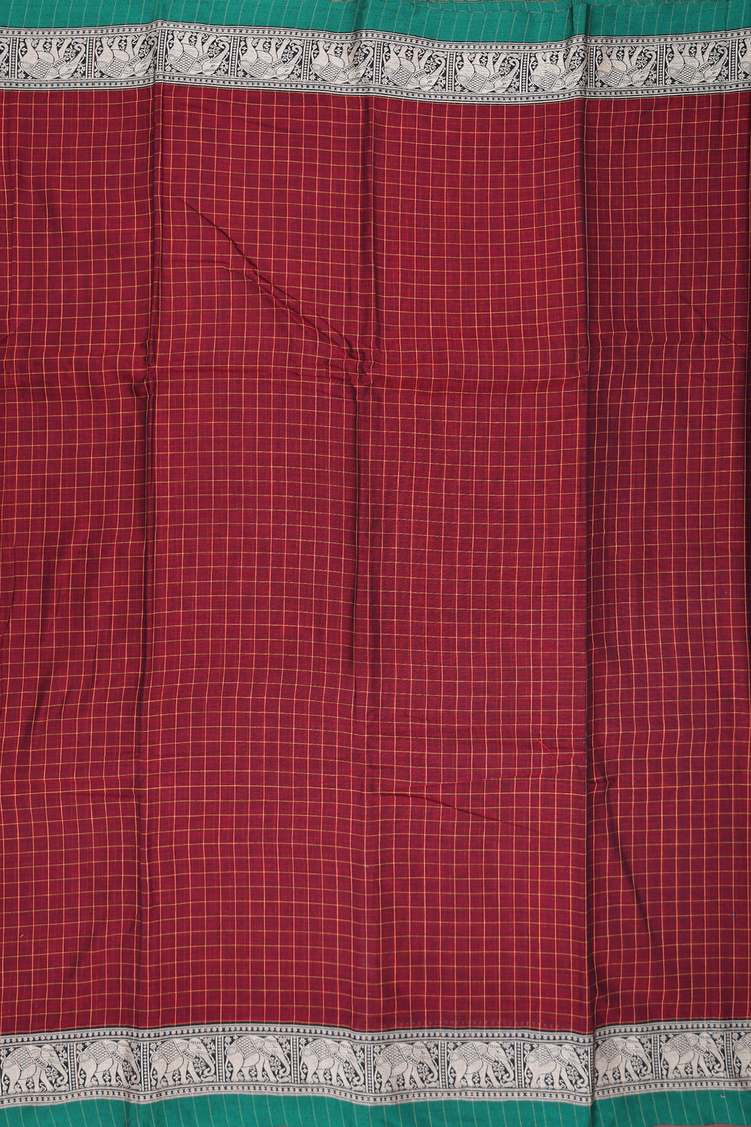 Elevate your ethnic wardrobe with this exquisite gadwal cotton saree, a timeless piece that seamlessly blends tradition with refined elegance. Crafted from premium gadwal cotton, known for its lightweight breathability and lustrous finish, this saree features a striking maroon base adorned with intricate checks design that adds visual depth and contemporary appeal.Â