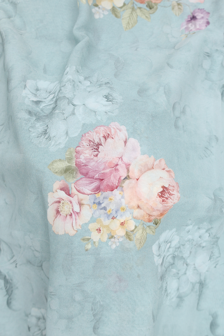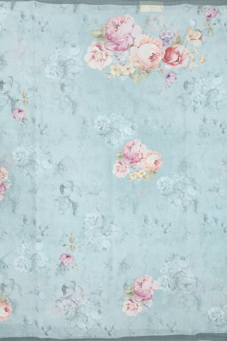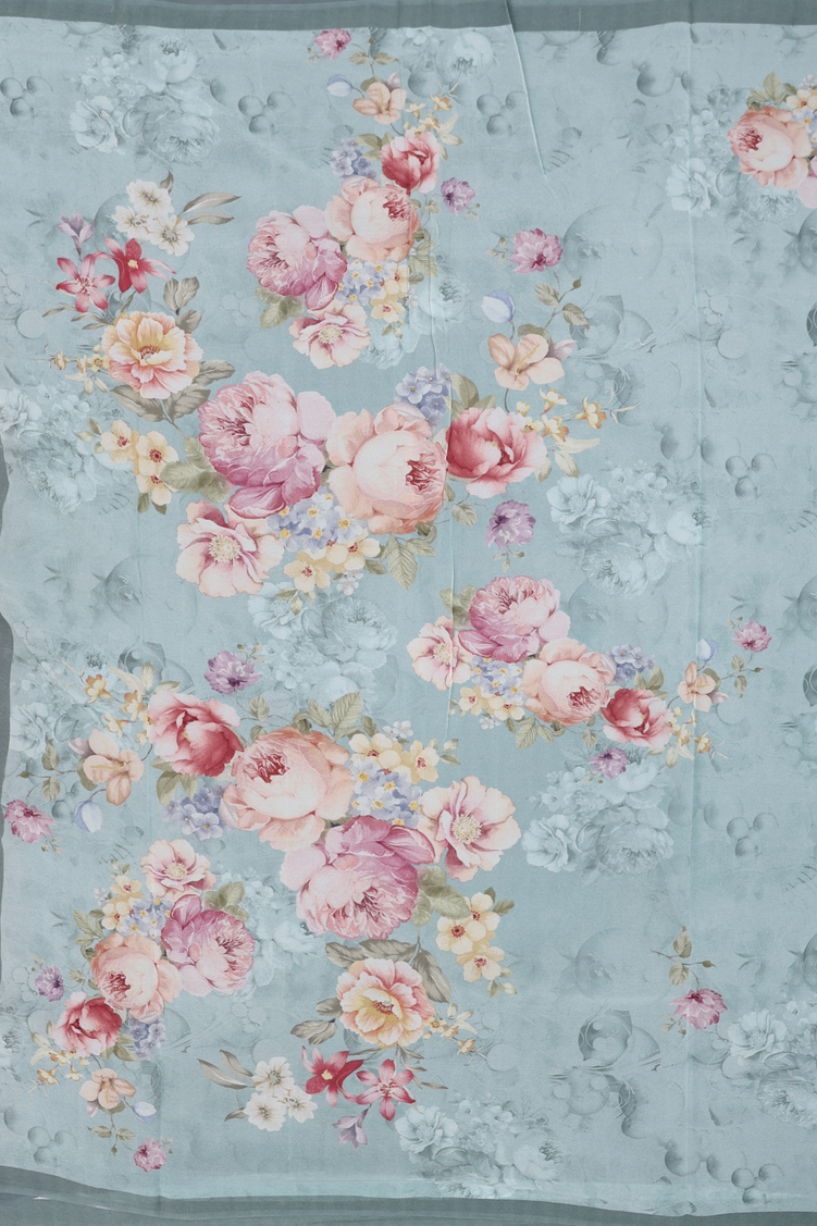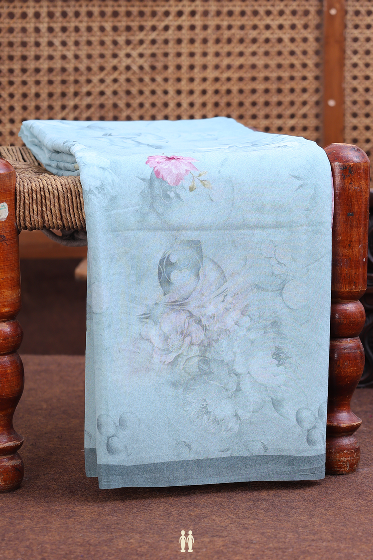 Elegant georgette saree in soft stone blue, adorned with delicate floral motifs throughout. Features a striking aegean blue border that frames the drape beautifully, adding depth and contrast to the design. The lightweight georgette fabric drapes gracefully, making it ideal for both casual gatherings and festive occasions. Includes a coordinating blouse piece, ready to wear. Perfect for those seeking a sophisticated blend of comfort and traditional style.