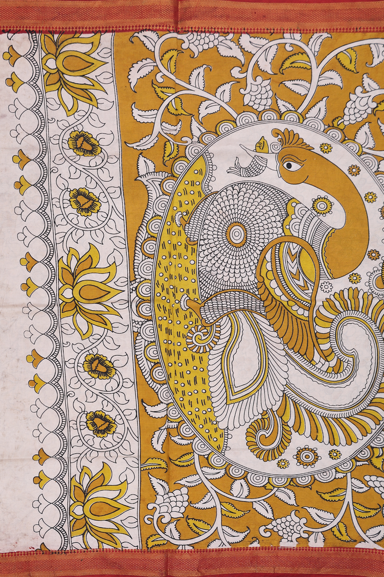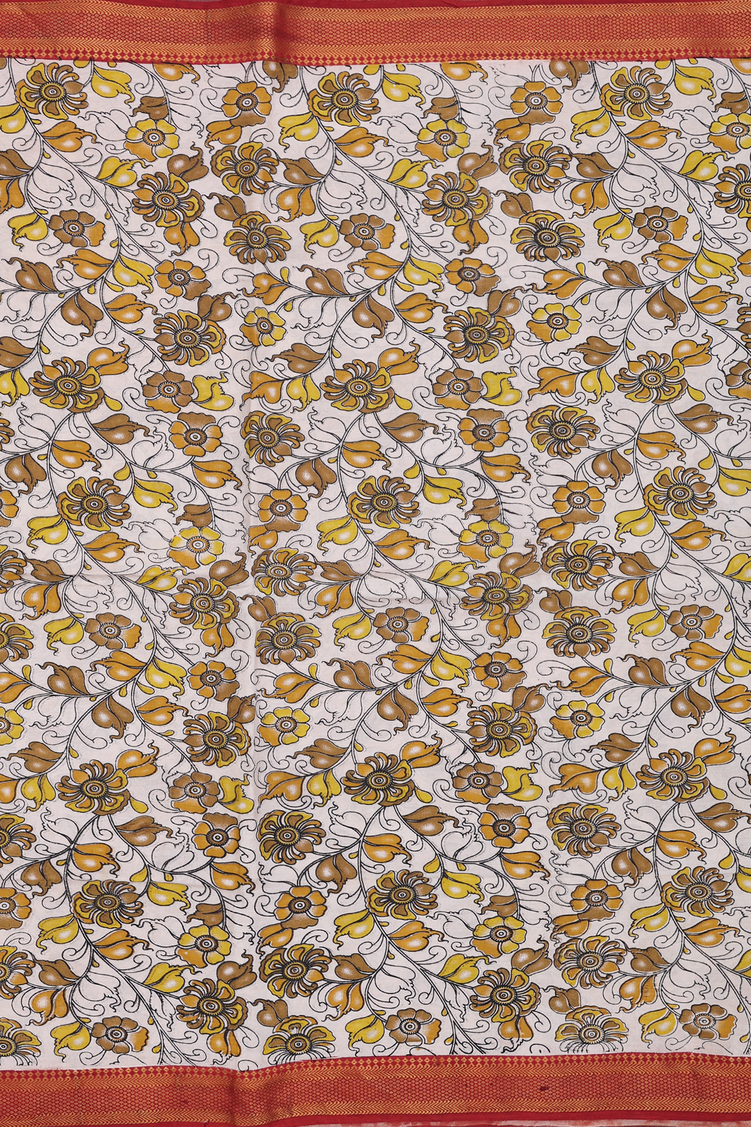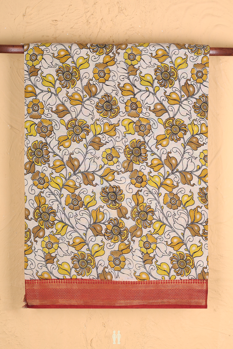 This Kalamkari cotton saree in beige features intricate floral motifs that highlight traditional artistry with a contemporary touch. Its breathable cotton fabric ensures comfort, making it ideal for both casual wear and special occasions. The subtle color palette combined with detailed hand-painted designs offers a refined elegance perfect for those who appreciate understated sophistication.