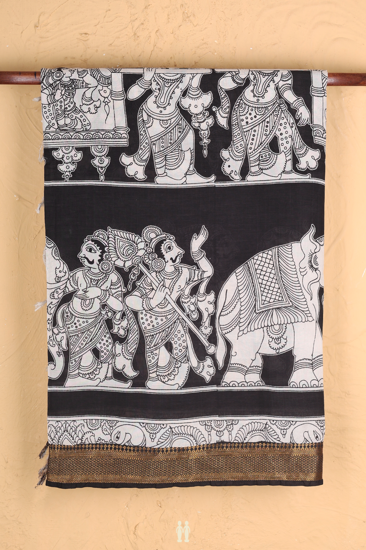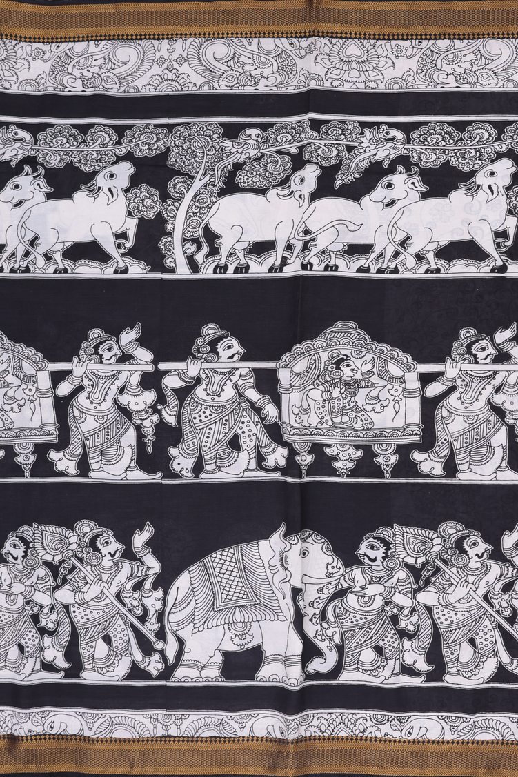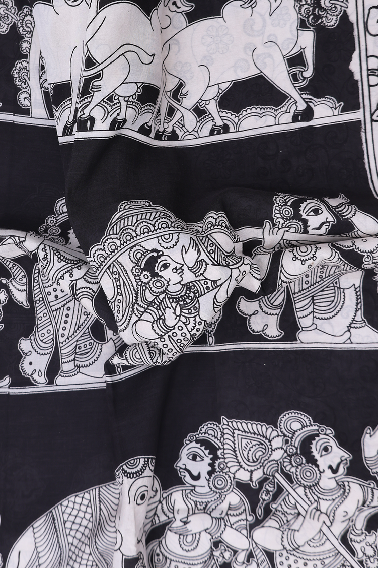 Elevate your traditional wardrobe with this kalamkari cotton saree in classic black. Featuring intricate printed designs, it blends artistic heritage with breathable comfort. Perfectly lightweight, it offers effortless elegance for day or evening wear, making it a timeless addition to your collection.
