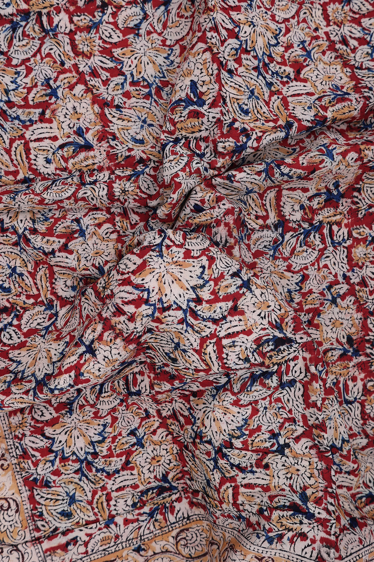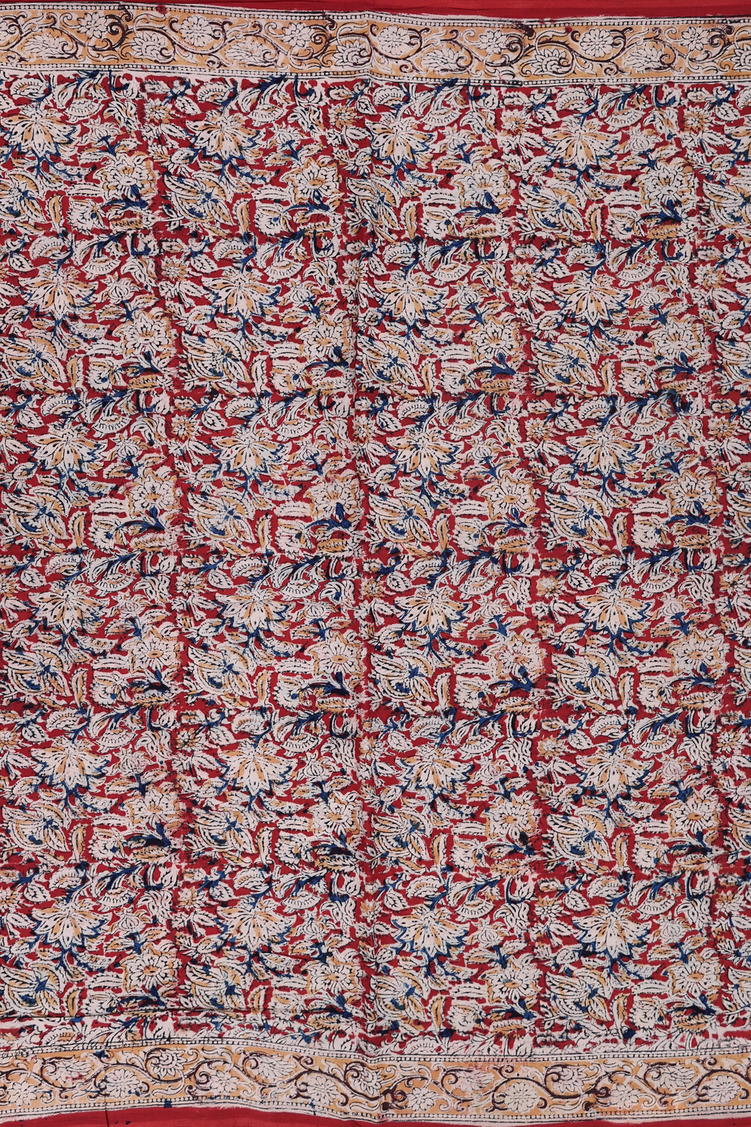 Kalamkari Cotton Saree In Brick Red With Floral Design