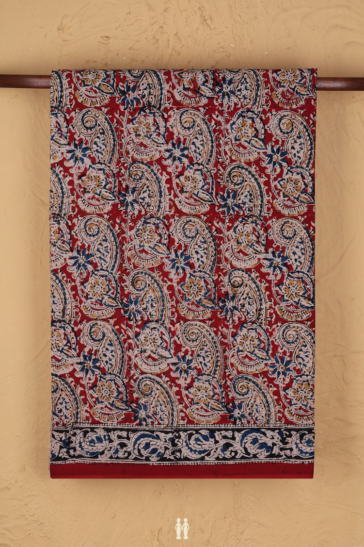 Kalamkari Cotton Saree In Brick Red With Paisley Design