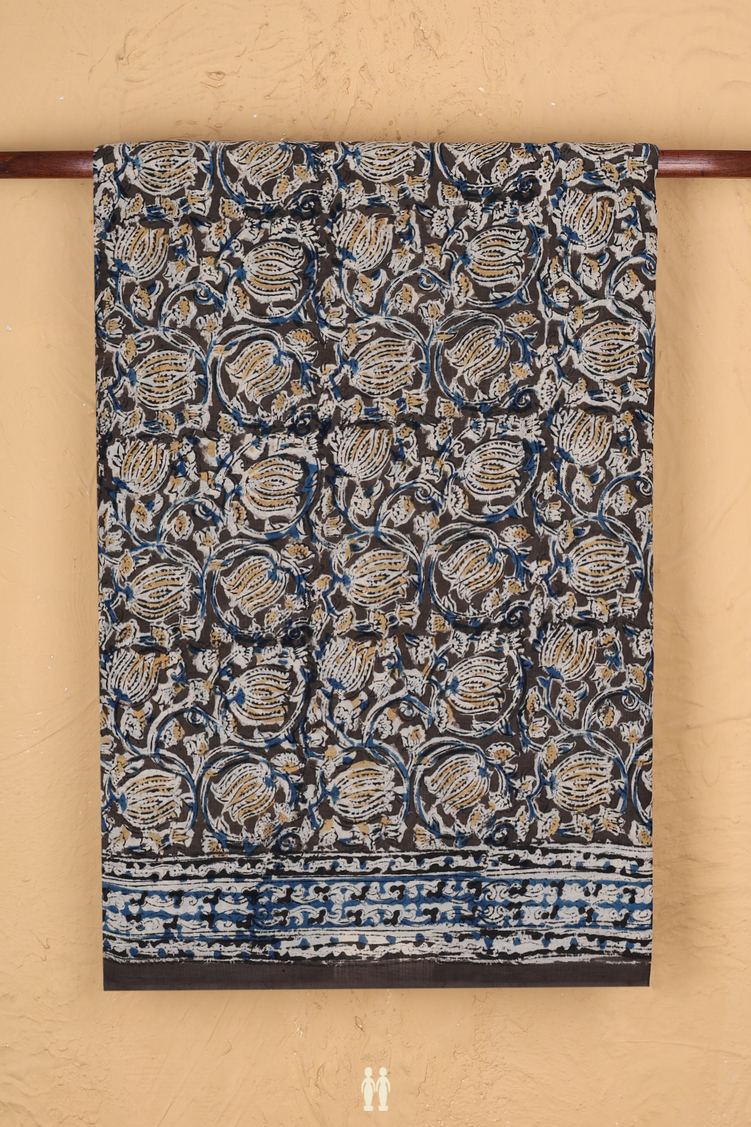 Kalamkari Cotton Saree In Olive Green With Floral Design