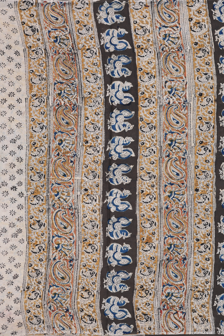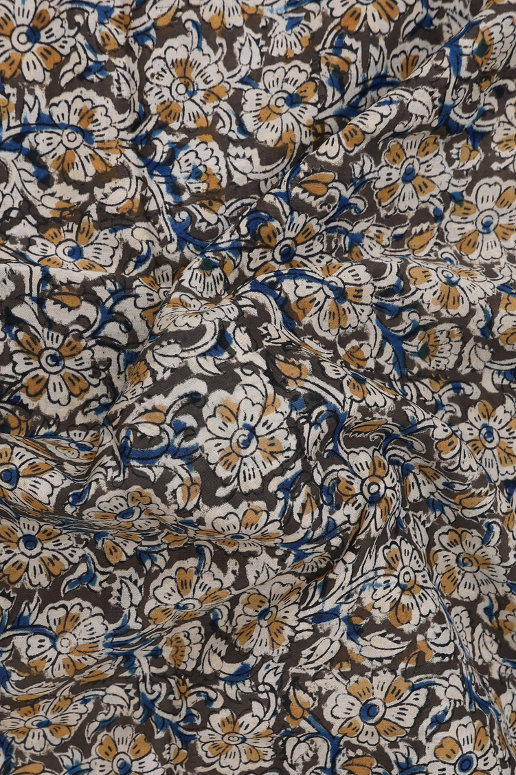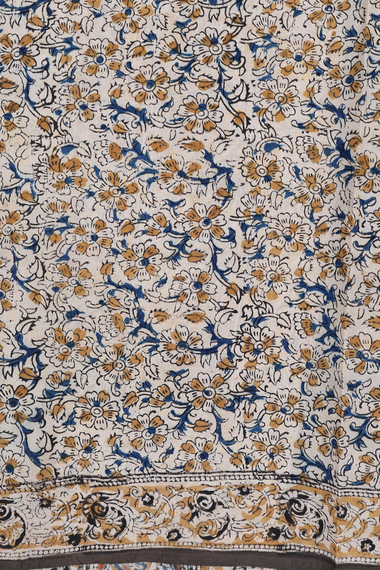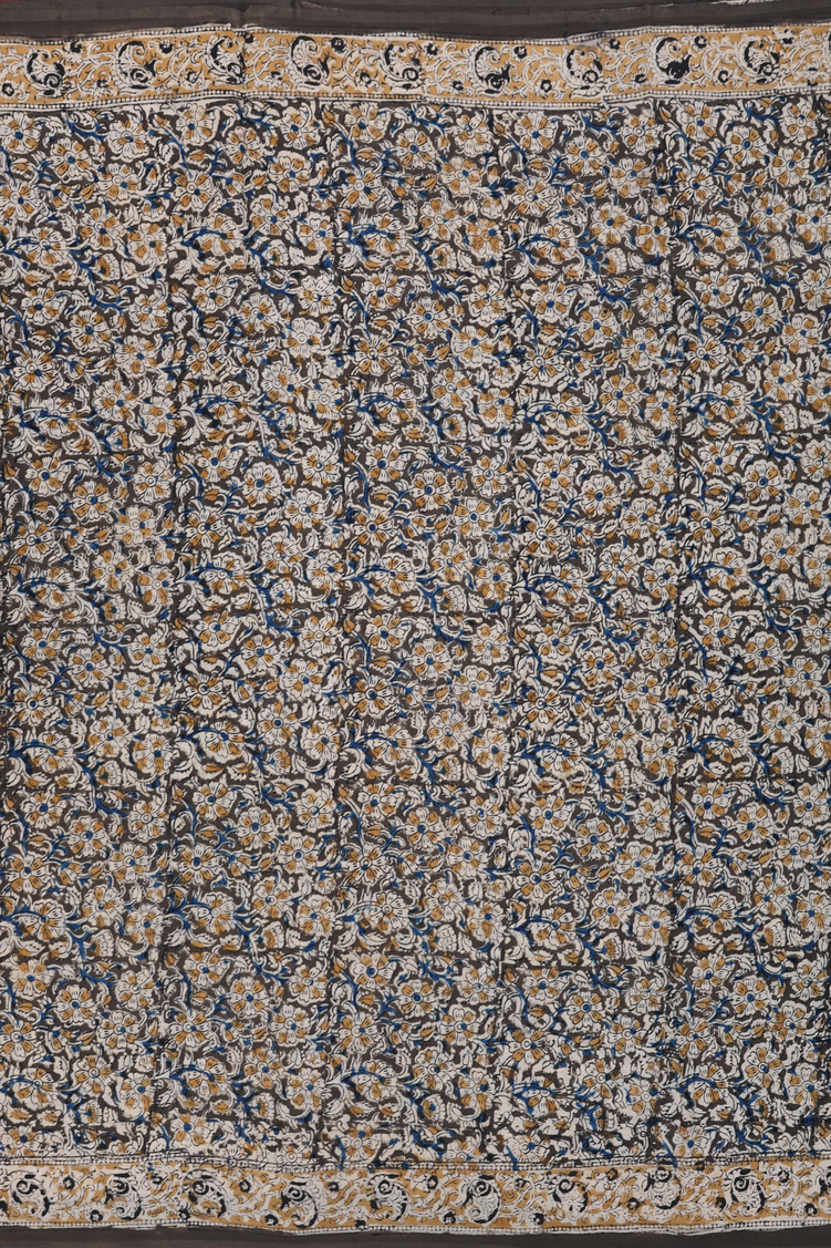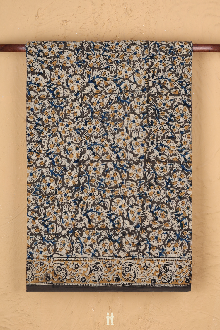 Kalamkari Cotton Saree In Olive Green With Floral Design