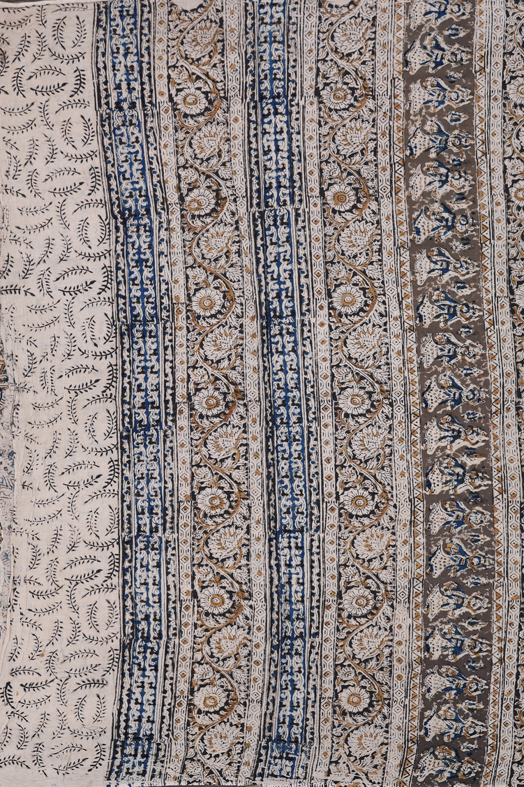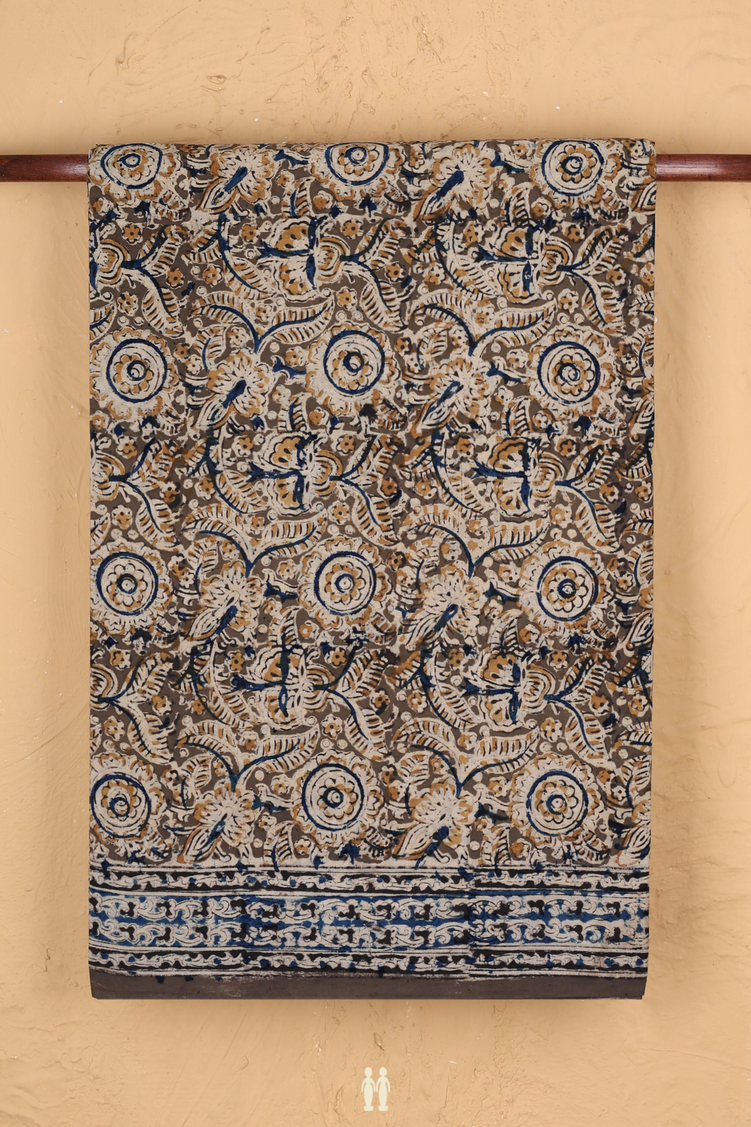 Kalamkari Cotton Saree In Olive Green With Floral Design