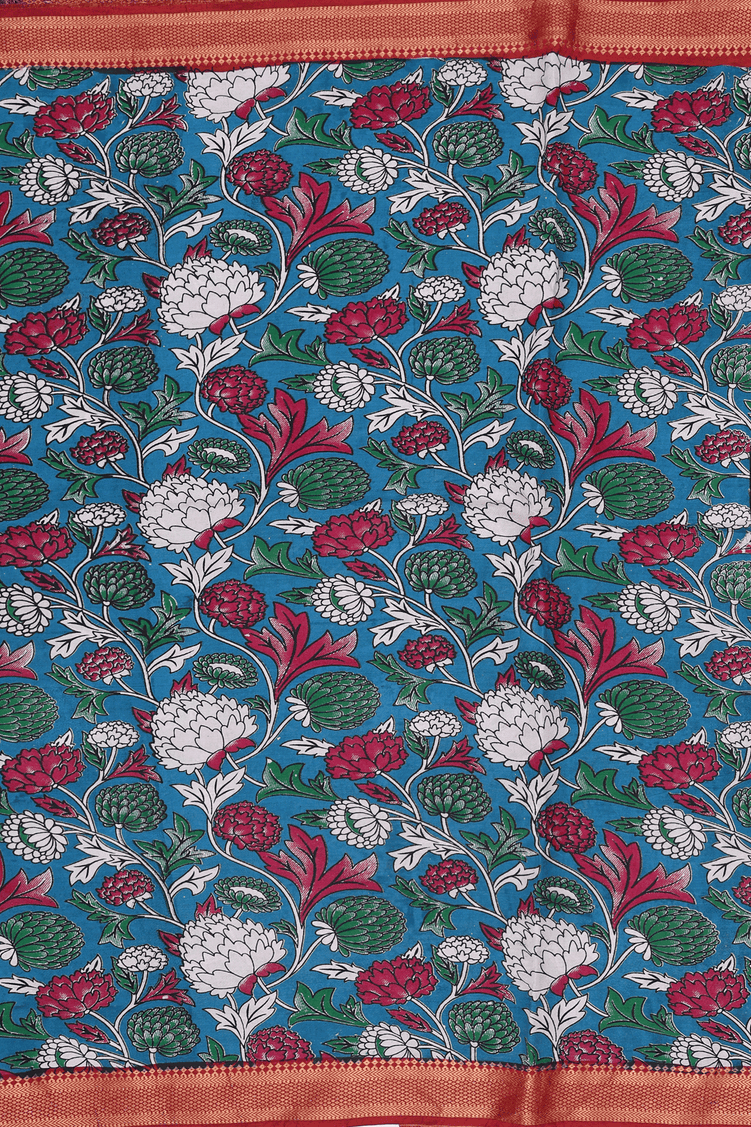 Kalamkari Cotton Saree In Teal Blue With Printed Design