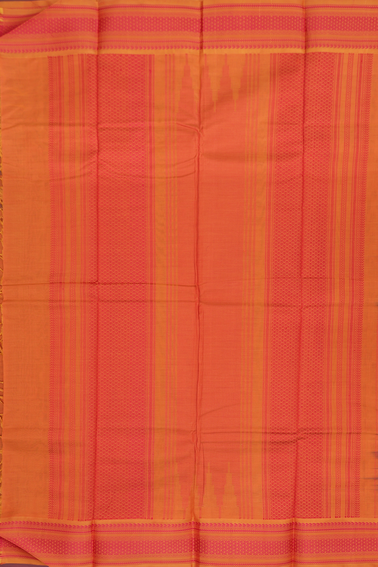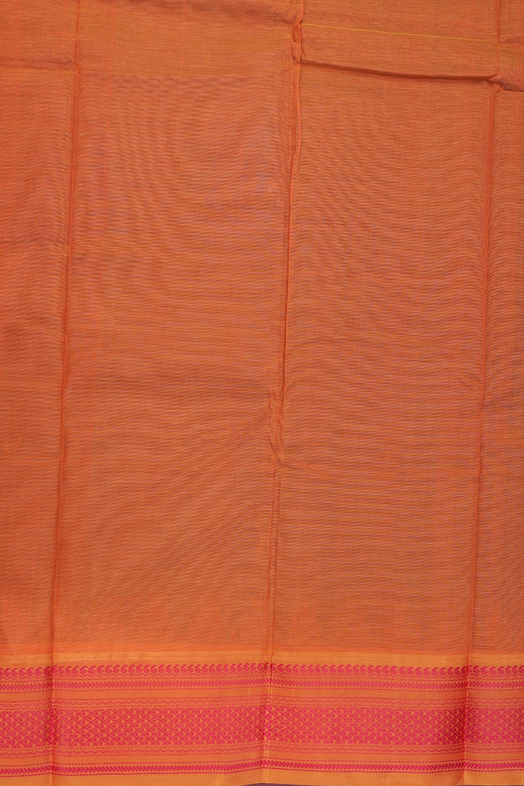 Elevate your ethnic wardrobe with this exquisite kanchi cotton saree in a rich forest green hue. Adorned with delicate threadwork buttas with contrast orange shade silk border that showcase traditional craftsmanship, this saree seamlessly blends timeless elegance with contemporary appeal.