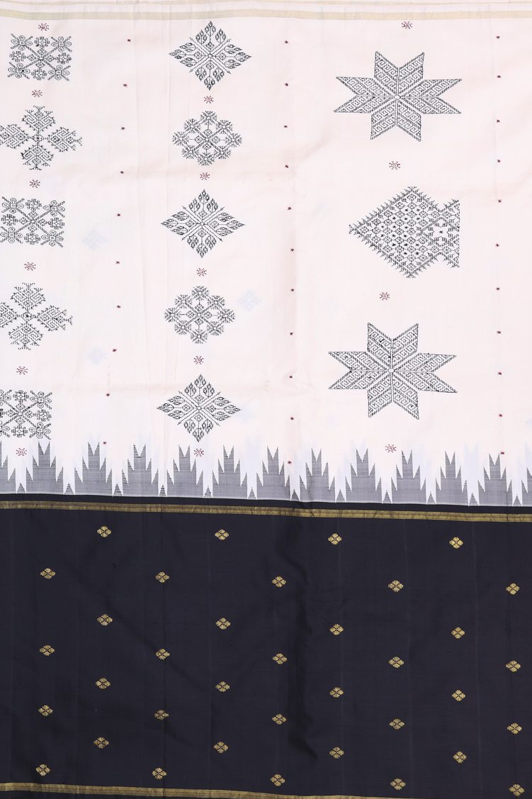 Elevate your wardrobe with this exquisite Kanchipuram silk saree, a timeless masterpiece woven in pristine white. Renowned for its lustrous finish and exceptional durability, Kanchipuram silk drapes beautifully while maintaining its shape. The intricate threadwork design adds refined elegance, creating subtle visual interest that complements both traditional and contemporary styling. Perfect for weddings, festivals, and formal occasions, this saree embodies the heritage craftsmanship of South India's most celebrated silk-weaving tradition. A versatile investment piece that transcends seasons and trends.