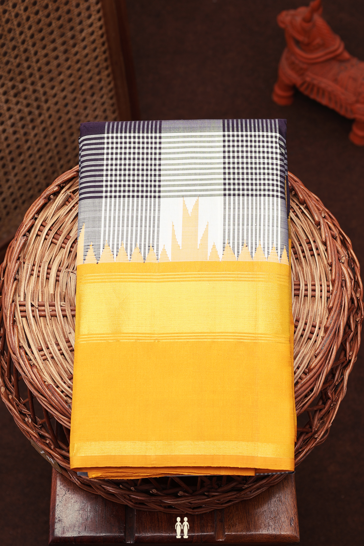 Elevate your elegance with this kanchipuram silk saree featuring a timeless black and white checked pattern. Crafted from rich silk, it offers a graceful drape and a subtle sheen, perfect for formal occasions and celebrations. The classic design balances tradition with modern style, making it a versatile addition to your wardrobe.