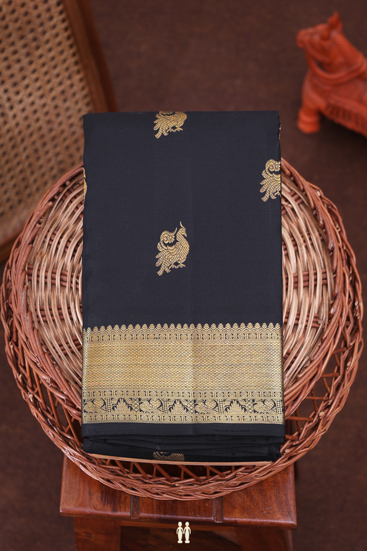 Kanchipuram Silk Saree In Black With Peacock Buttas