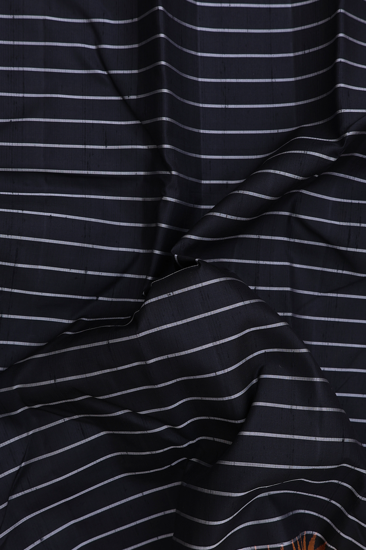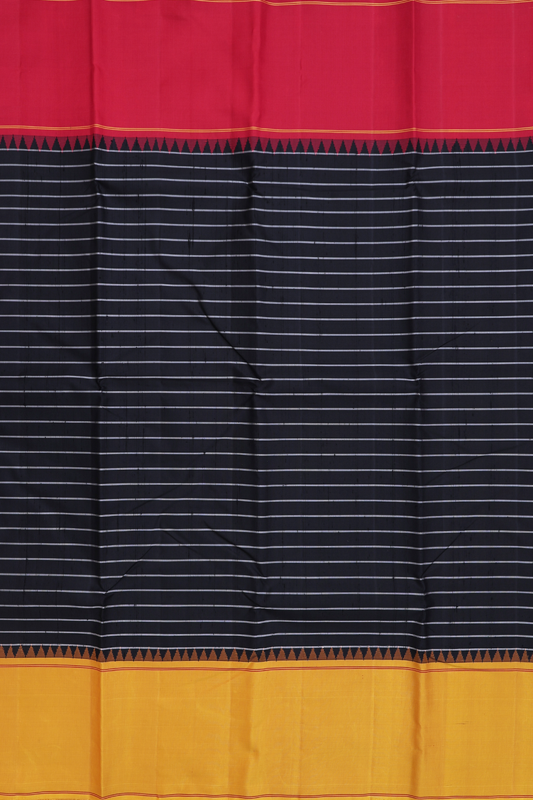 Elevate your ethnic wardrobe with this exquisite kanchipuram silk saree with ganga jamuna border, a timeless masterpiece crafted from the finest silk. The striking black base is beautifully complemented by elegant stripe detailing, creating a refined aesthetic that transitions seamlessly from traditional occasions to contemporary celebrations. Known for its lustrous finish and superior drape, authentic Kanchipuram silk offers unparalleled comfort and durability. This versatile saree pairs effortlessly with classic jewelry and traditional styling, making it an essential addition to any discerning woman's collection.