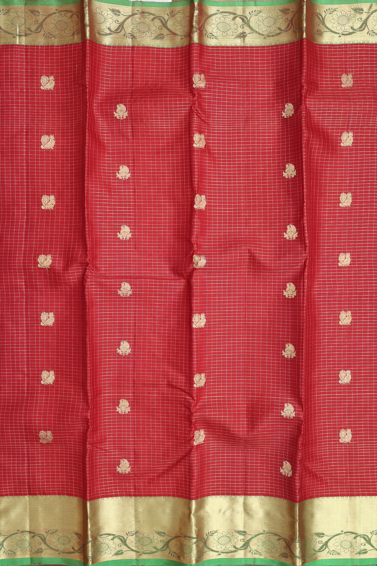 Kanchipuram Silk Saree In Brick Red With Checks Design