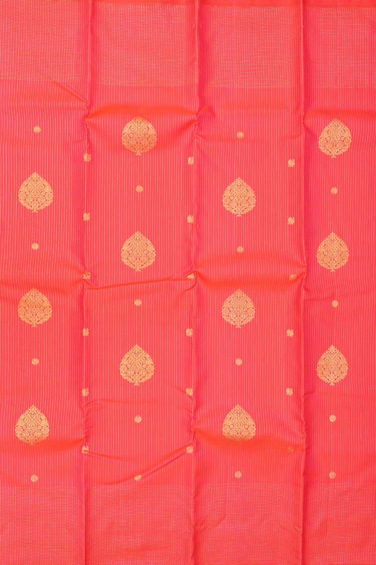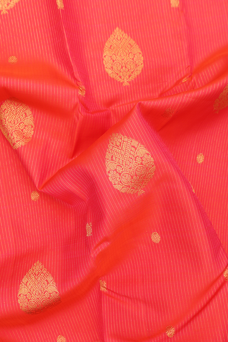 Kanchipuram Silk Saree In Coral Red Along Stripes With Buttas