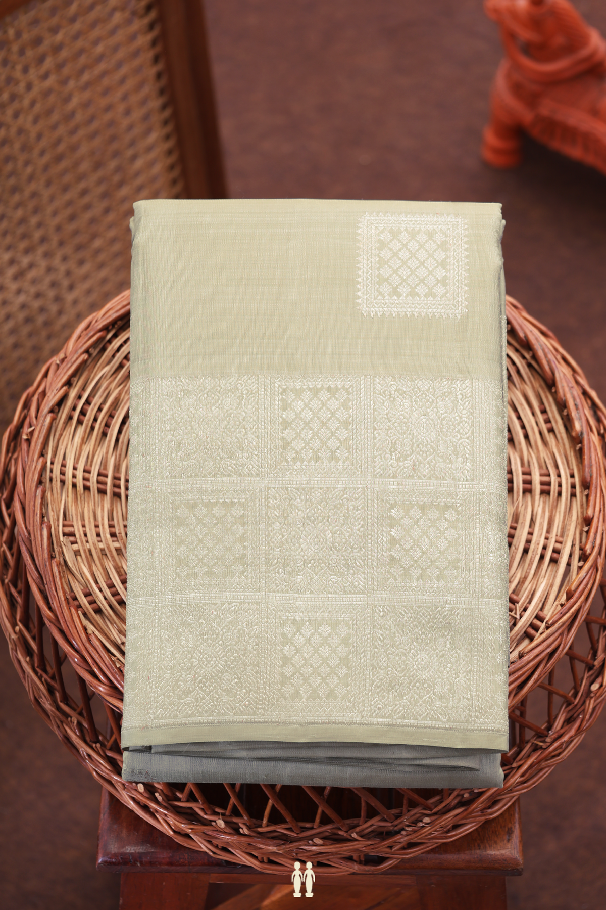 Elevate your wardrobe with this exquisite kanchipuram silk saree in a muted dusty green shade. Featuring elegant square motifs woven with precision, it beautifully blends tradition with contemporary style. The rich silk fabric ensures a graceful drape, perfect for formal occasions and celebrations. This saree is a timeless piece that reflects sophistication and refined craftsmanship.