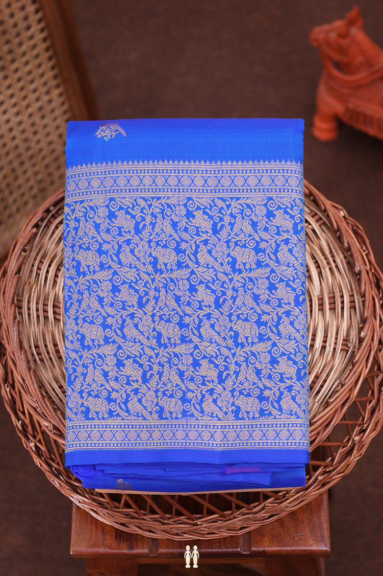 Kanchipuram Silk Saree In Indigo Blue With Peacock Buttas