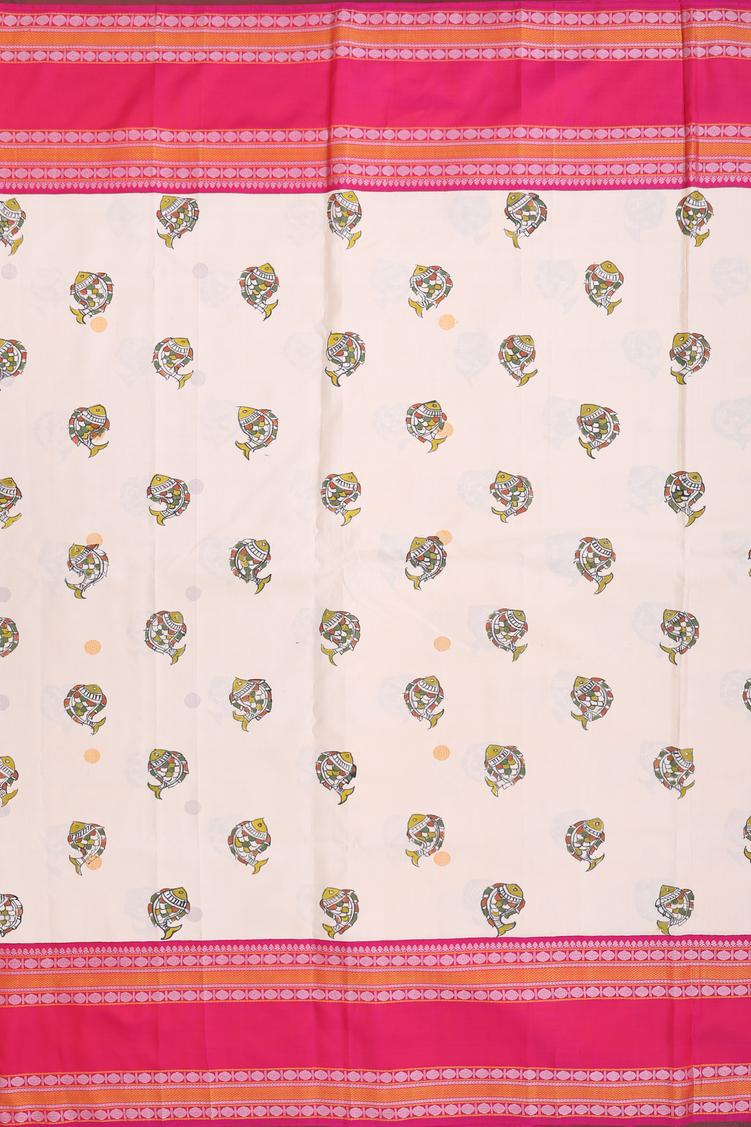 Kanchipuram Silk Saree In Ivory With Fish Hand Painted Desig