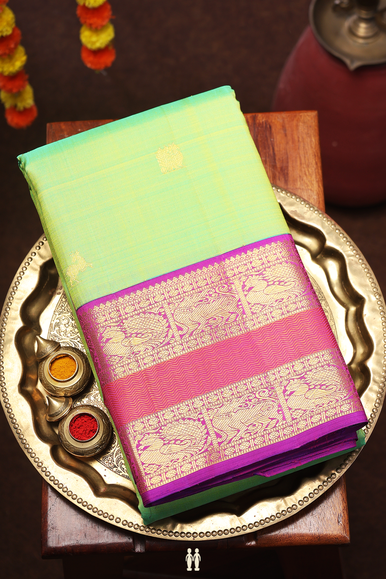 Kanchipuram Silk Saree In Parrot Green With Peacock Buttas