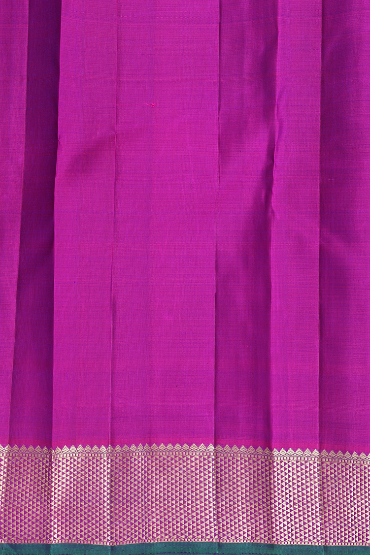 Draped in luxurious kanchipuram silk, this regal purple saree showcases the timeless iruthalai pakshi butta—an intricate motif inspired by the majestic parrot. Hand-woven with meticulous craftsmanship, each butta is a testament to south indian textile artistry and the classic border completed by green selvedge. The rich purple hue exudes elegance and grace, making it an ideal choice for weddings, festivals, and formal celebrations. The natural sheen of pure silk enhances the beauty of the traditional design, while the saree's drape ensures effortless sophistication. A treasured piece that honors heritage while elevating your wardrobe.