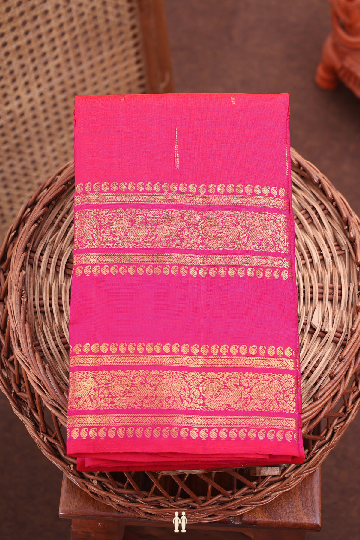 Elevate your ethnic wardrobe with this exquisite kanchipuram silk saree in a regal rani pink hue. Handwoven using traditional techniques, this saree features delicate malli moggu (jasmine flower) buttas that add timeless elegance and intricate detailing. The lustrous silk fabric drapes beautifully, offering both comfort and grace for weddings, festivals, and special occasions. A quintessential choice for those who appreciate authentic South Indian craftsmanship and refined aesthetics.