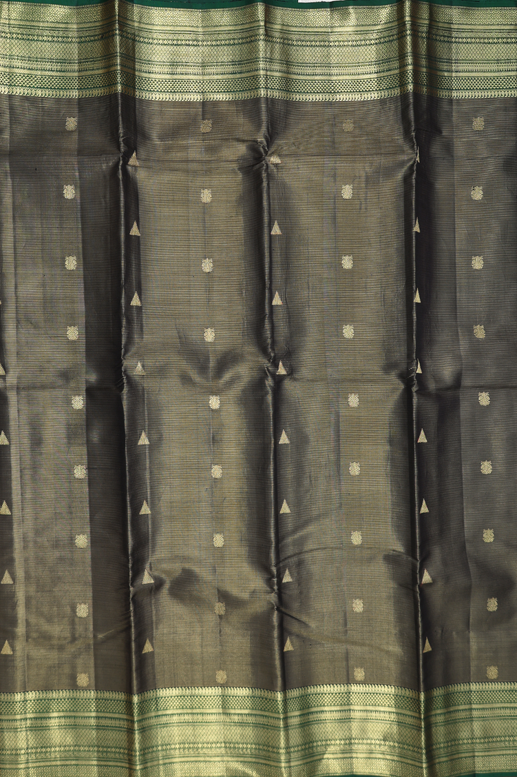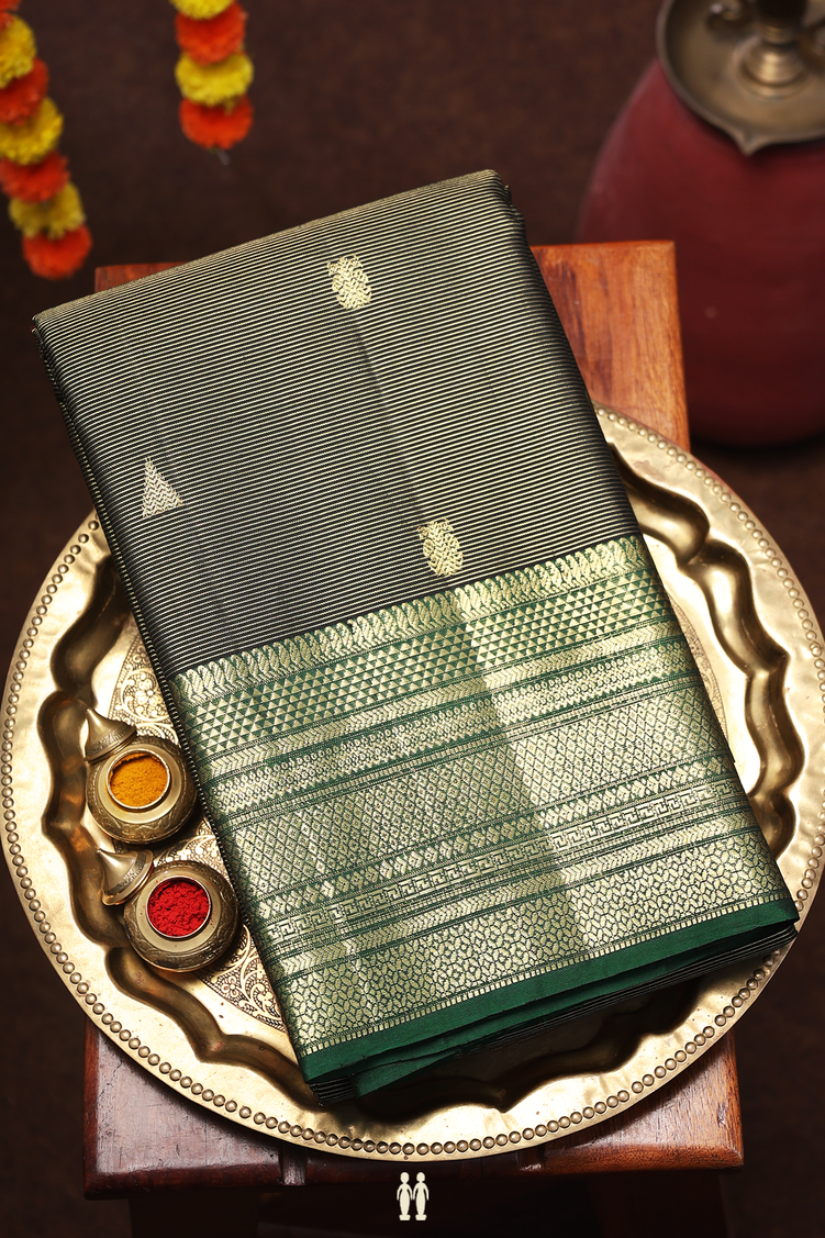 Elevate your elegance with this exquisite kanchipuram silk saree in timeless black. Featuring finely woven stripes, its rich silk texture offers a graceful drape that complements formal and festive occasions alike. This saree blends traditional craftsmanship with refined style, making it a distinguished choice for those who appreciate subtle sophistication.