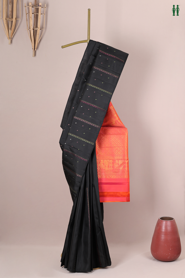 Kanchipuram Silk Saree In Black Along Stripes With Buttas
