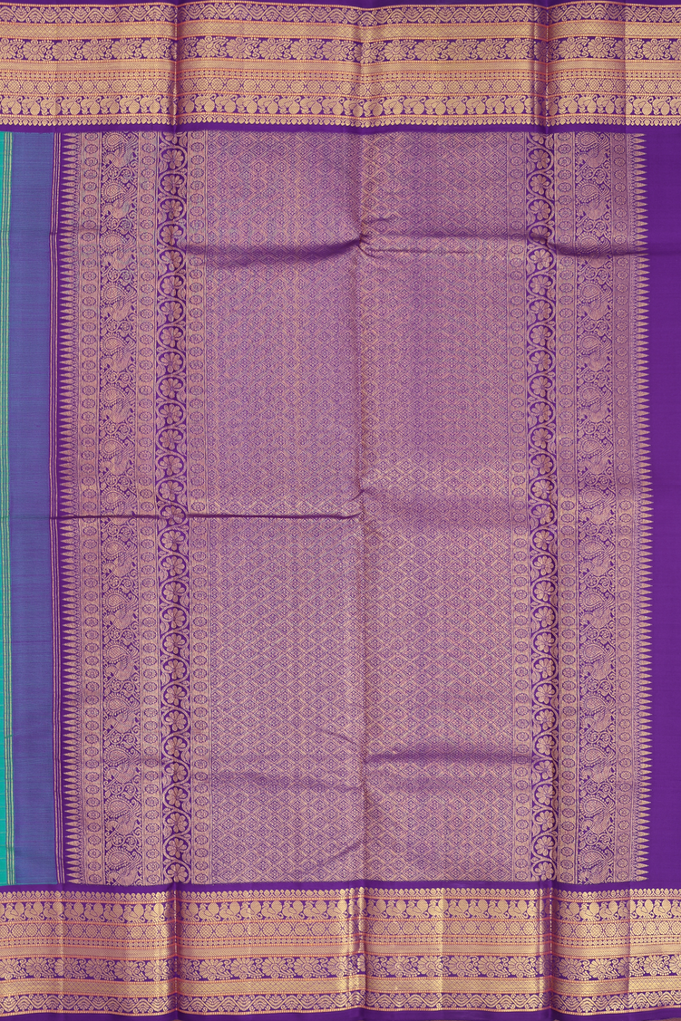 Elevate your ethnic wardrobe with this stunning kanchipuram silk saree in rich teal blue, featuring an intricate checks design that adds contemporary flair to traditional elegance. The saree is beautifully complemented by a contrasting purple traditional border that frames the pallu and edges, creating a striking visual appeal. Handwoven from pure Kanchipuram silk, this saree offers a luxurious drape and natural sheen that enhances your grace and poise. The checks pattern brings a modern twist to classic silk weaving, making it perfect for festive occasions, weddings, and celebrations where you want to make a sophisticated statement. The contrast purple border showcases traditional craftsmanship and adds depth to the overall design.