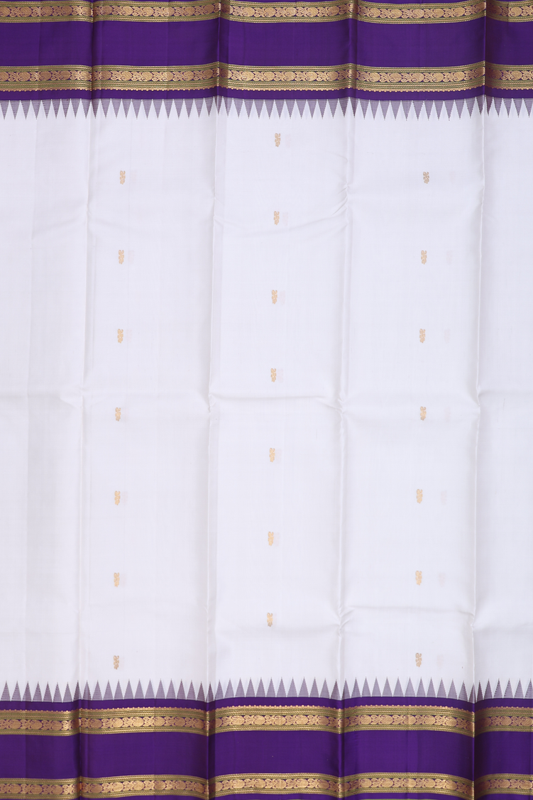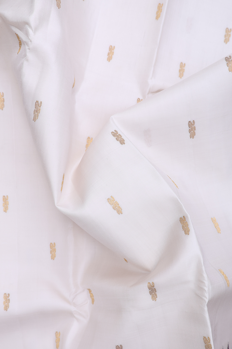 Elevate your elegance with this kanchipuram silk saree in pristine white, adorned with delicate floral buttas. Crafted from rich silk, its timeless design offers a sophisticated charm perfect for special occasions. The intricate floral motifs add subtle grace, making it a refined choice for those who appreciate classic beauty and craftsmanship.