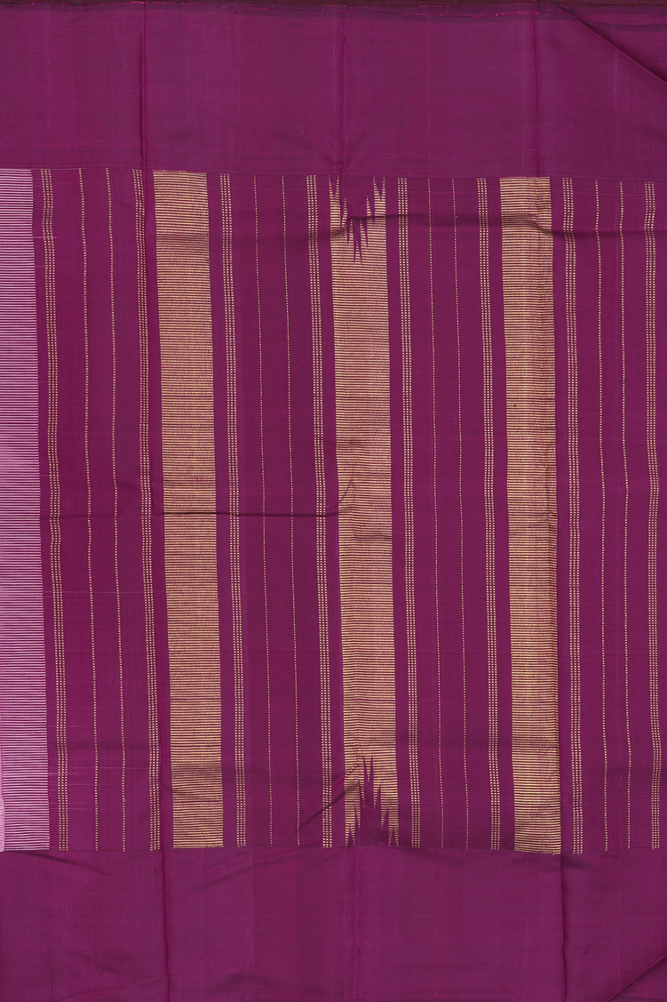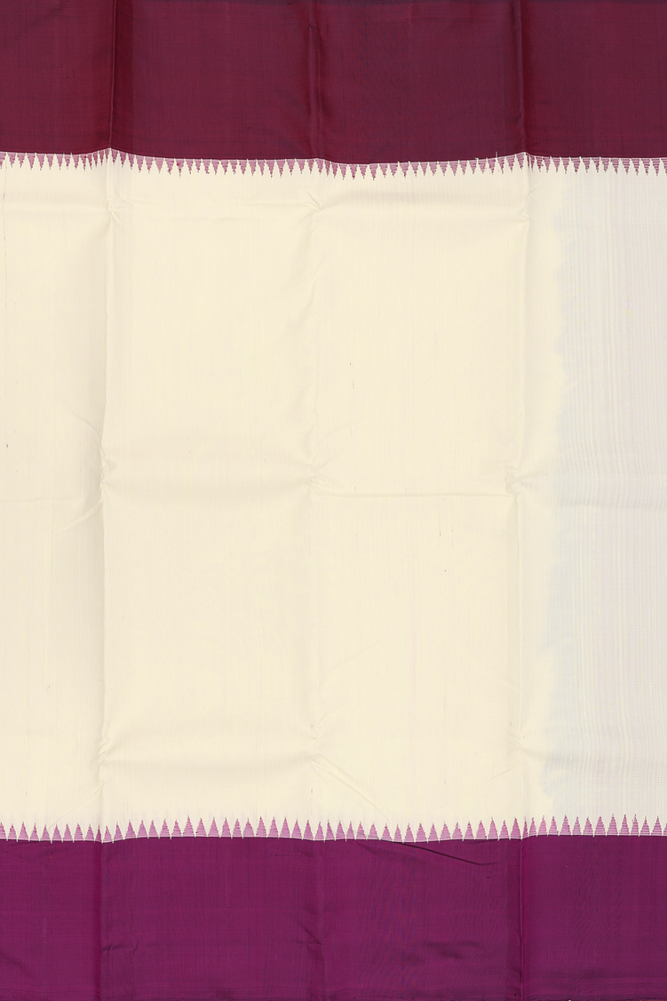 Elegant kanchipuram silk saree in pristine white, adorned with the iconic Ganga Jamuna border featuring rich burgundy red and plum purple hues. Crafted using traditional jute weaving methods that showcase intricate craftsmanship and authentic South Indian textile heritage. The contrasting border design adds timeless sophistication, making it perfect for weddings, festivals, and special occasions. Drapes beautifully with a luxurious sheen characteristic of pure Kanchipuram silk. A wardrobe essential that celebrates classical Indian elegance.