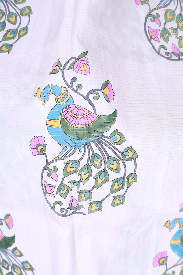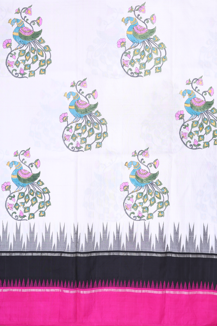 Kanchipuram Silk Saree In White With Peacock Hand Painted