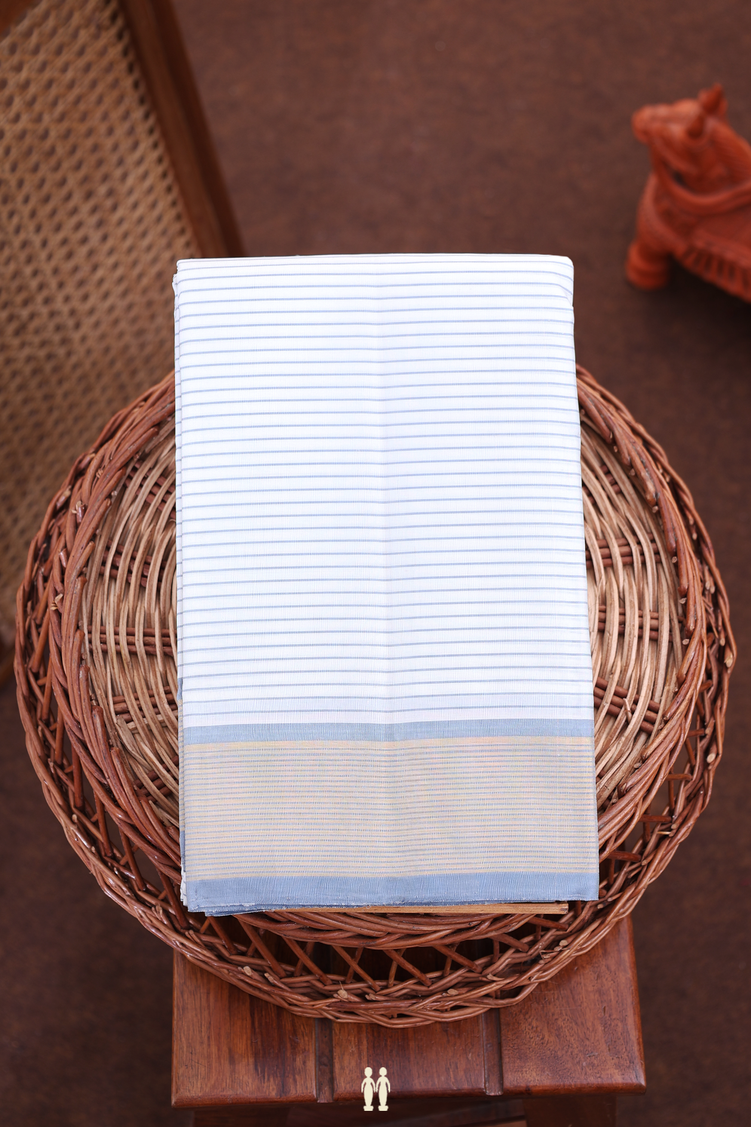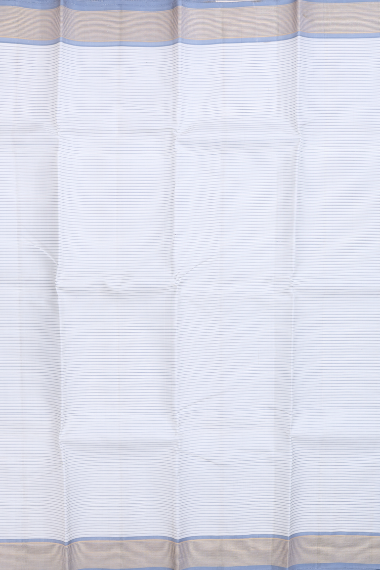 This elegant kanchipuram silk saree in pristine white features a timeless stripes design, blending tradition with understated sophistication. Crafted with rich silk, it offers a smooth drape and subtle sheen, making it perfect for both formal occasions and cultural celebrations. A classic addition to your wardrobe that embodies grace and refined style.