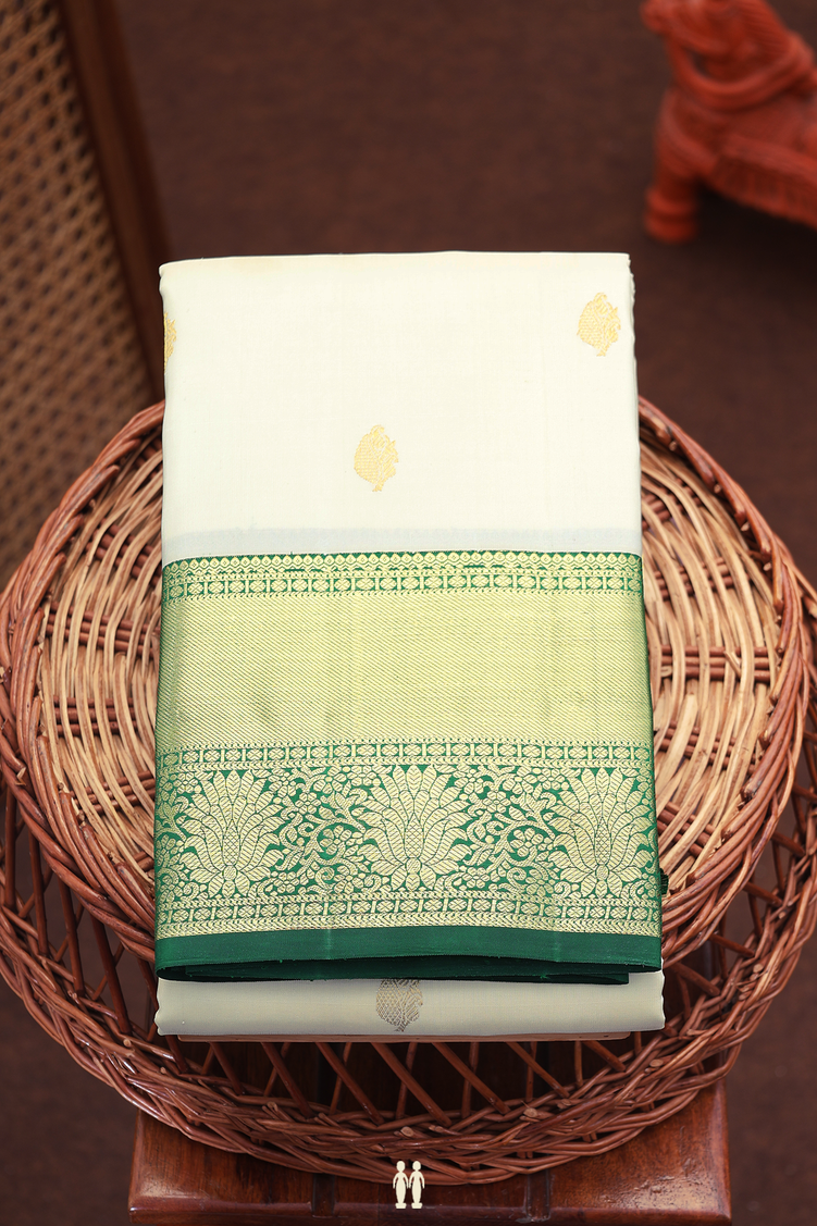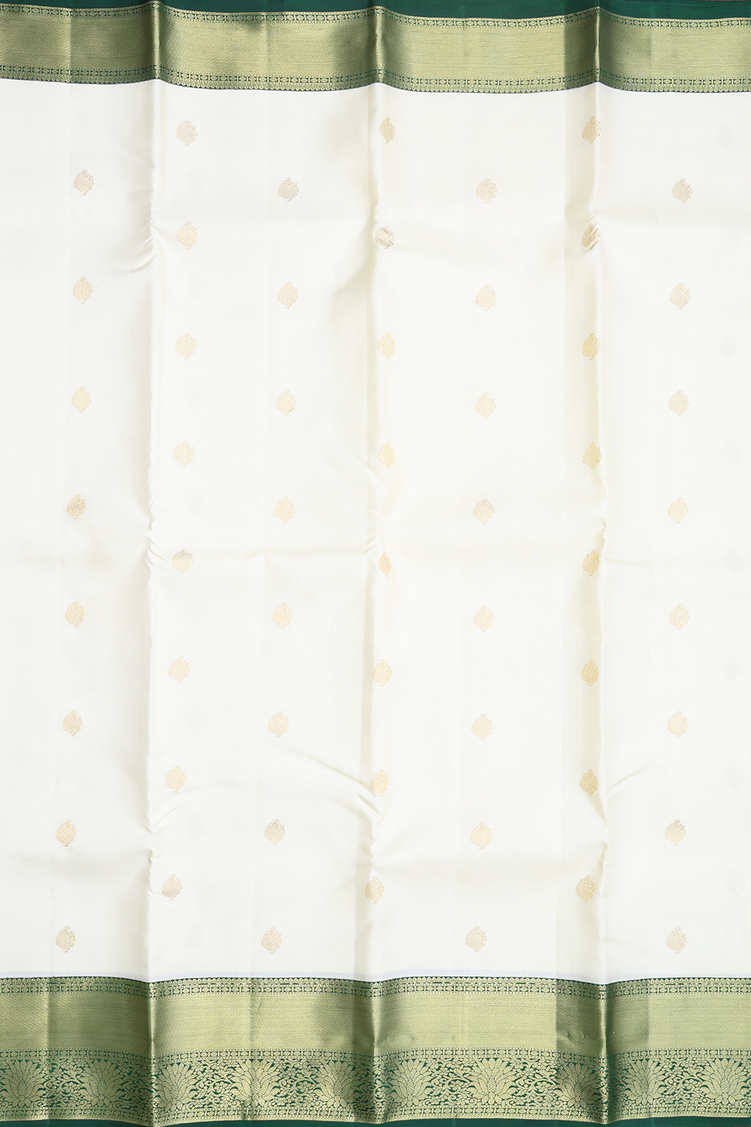 Experience timeless elegance with this kanchipuram silk saree in pristine white, adorned with intricate zari buttas. Crafted to perfection, the rich silk fabric combined with shimmering gold accents offers a refined look perfect for special occasions. Its classic design elevates your traditional attire, ensuring you stand out with understated sophistication.