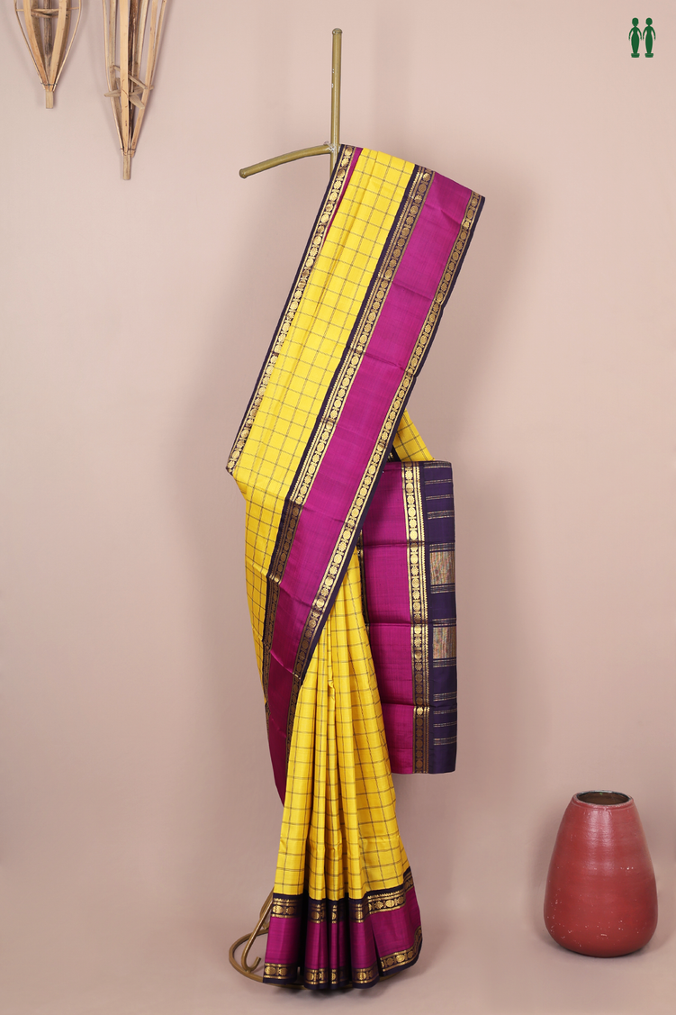 Kanchipuram Silk Saree In Yellow With Checks Design