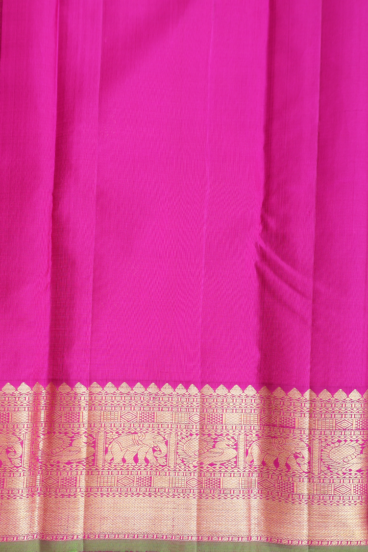 Discover timeless elegance with this kanchipuram silk saree in delicate pastel green, adorned with shimmering zari buttas and the contrast pink border completed by greeb selvedge. Crafted from premium pure silk, this saree showcases the finest traditions of South Indian weaving with its soft, luminous fabric and intricate gold thread motifs. The gentle hue complements all skin tones while the ornamental buttas add understated luxury. Perfect for celebrations, festivals, and formal gatherings, this heritage piece embodies grace and sophistication with every wear.