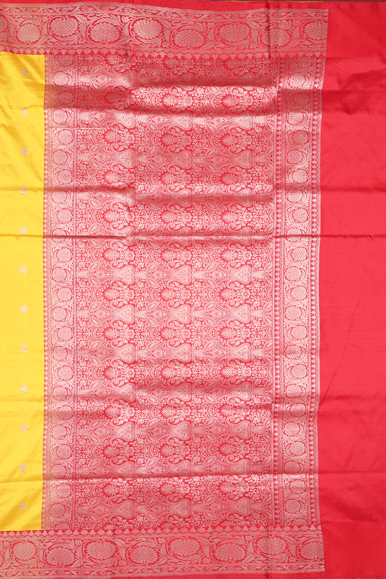 Banarasi Silk Saree In Saffron Yellow With Floral Buttas