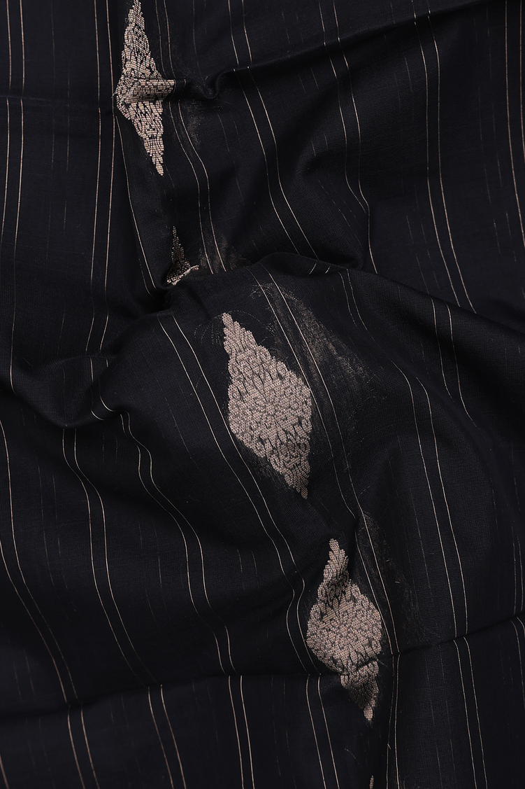 Elevate your elegance with this kora silk cotton saree in black, featuring a timeless stripes design. Crafted from a blend of silk and cotton, it offers a graceful drape and comfortable wear, perfect for both formal occasions and festive celebrations. The subtle sheen of Kora silk combined with the breathable cotton ensures you stay stylish and comfortable throughout the day. A refined choice for those who appreciate classic sophistication with a modern touch.