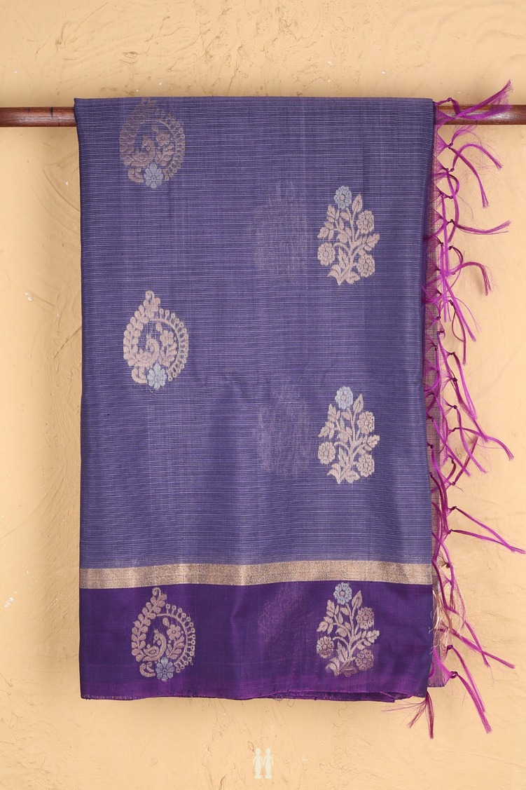 Kora Silk Cotton Saree In Purplish Blue With Floral Motifs