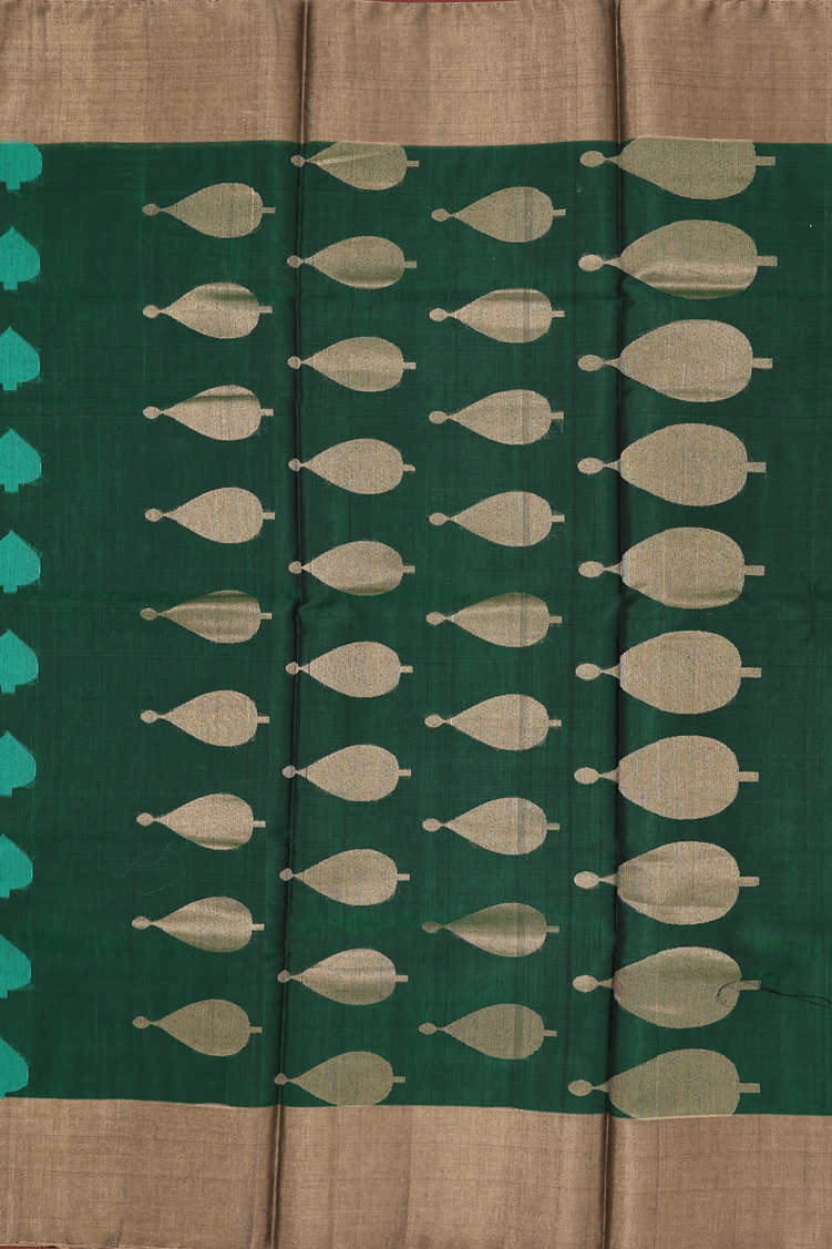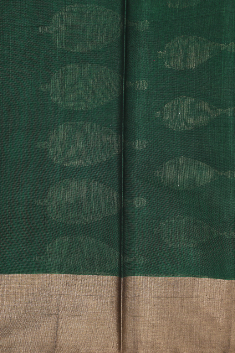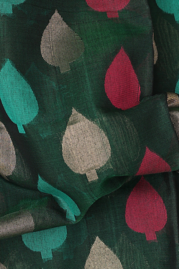 Kora Silk Cotton Saree In Forest Green With Leaf Buttas