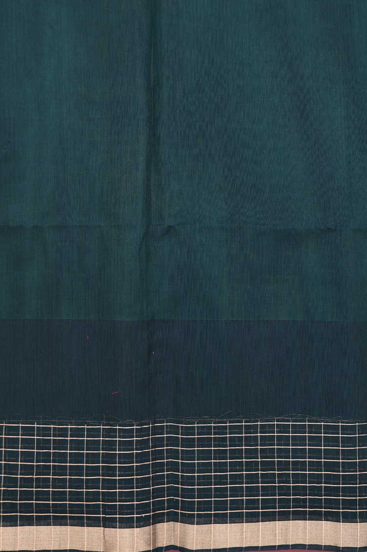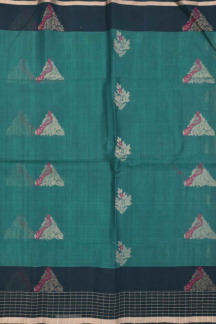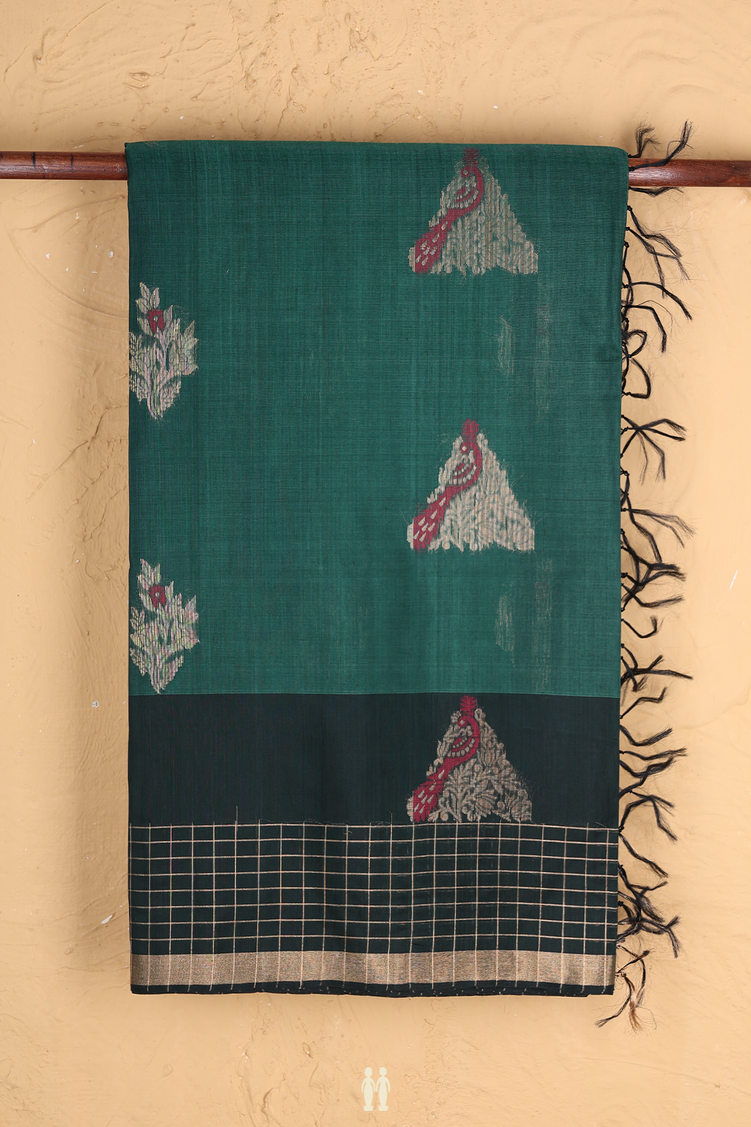 Kora Silk Cotton Saree In Forest Green With Peacock Design