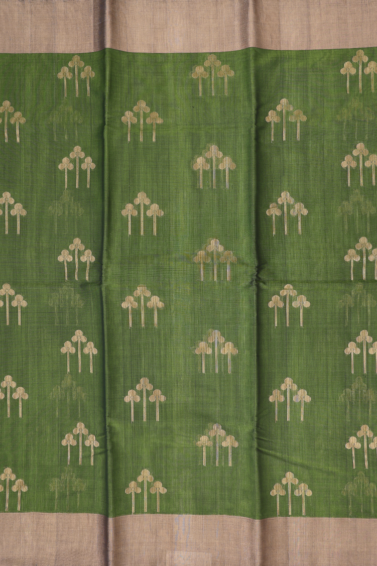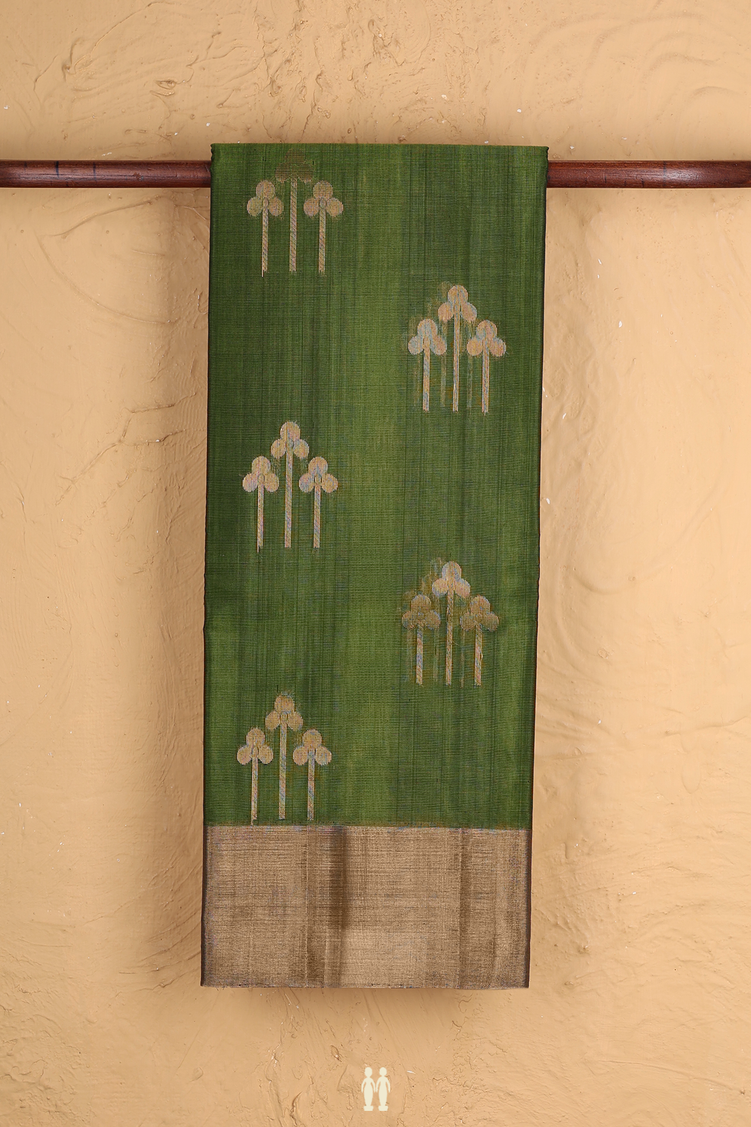 Kora Silk Cotton Saree In Olive Green With Floral Motifs