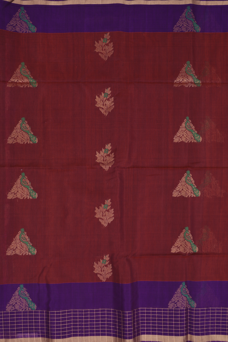 Kora Silk Cotton Saree In Rust Red With Peacock Motifs