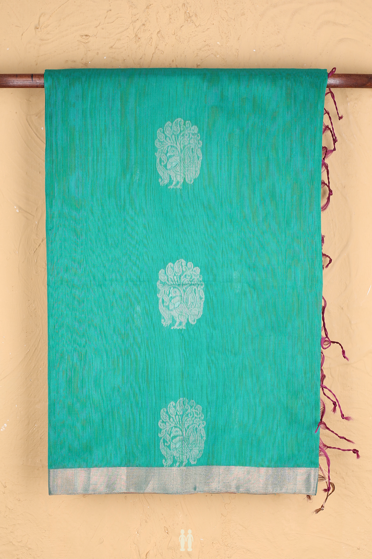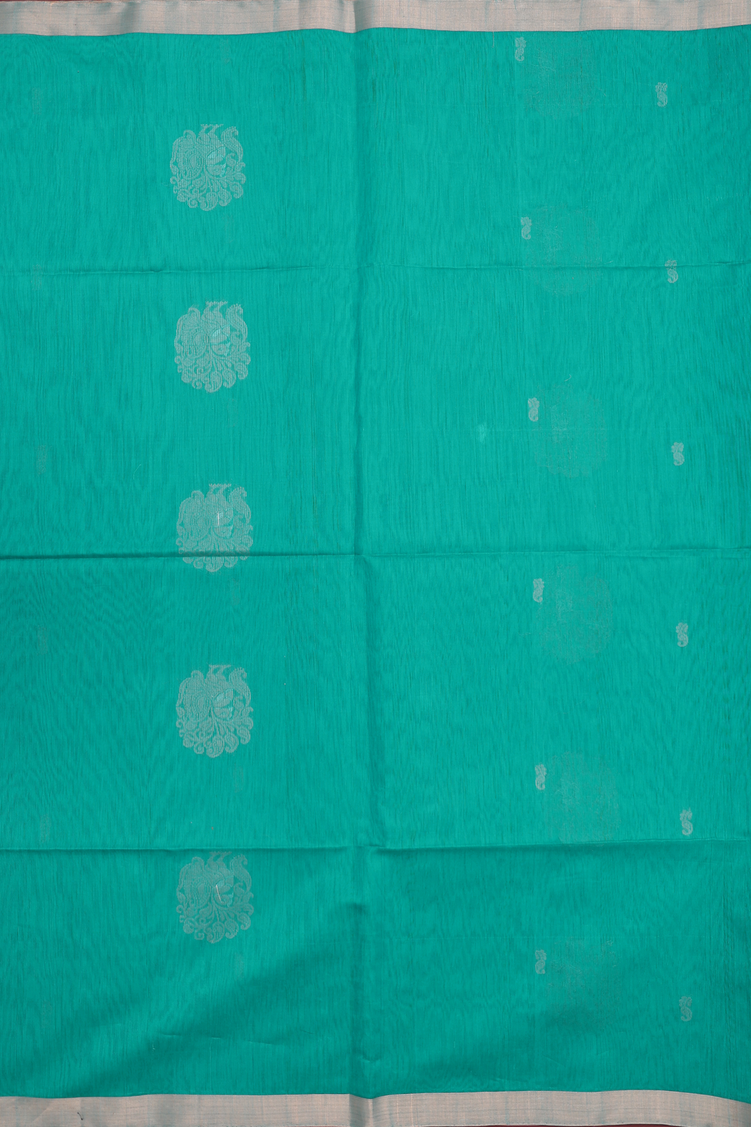 Kora Silk Cotton Saree In Sea Green With Peacock Motifs