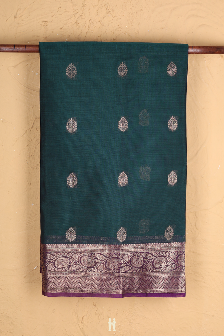 Kora Silk Cotton Saree In Teal Blue With Zari Buttas