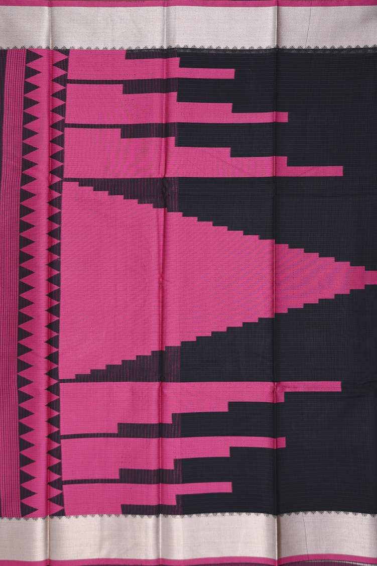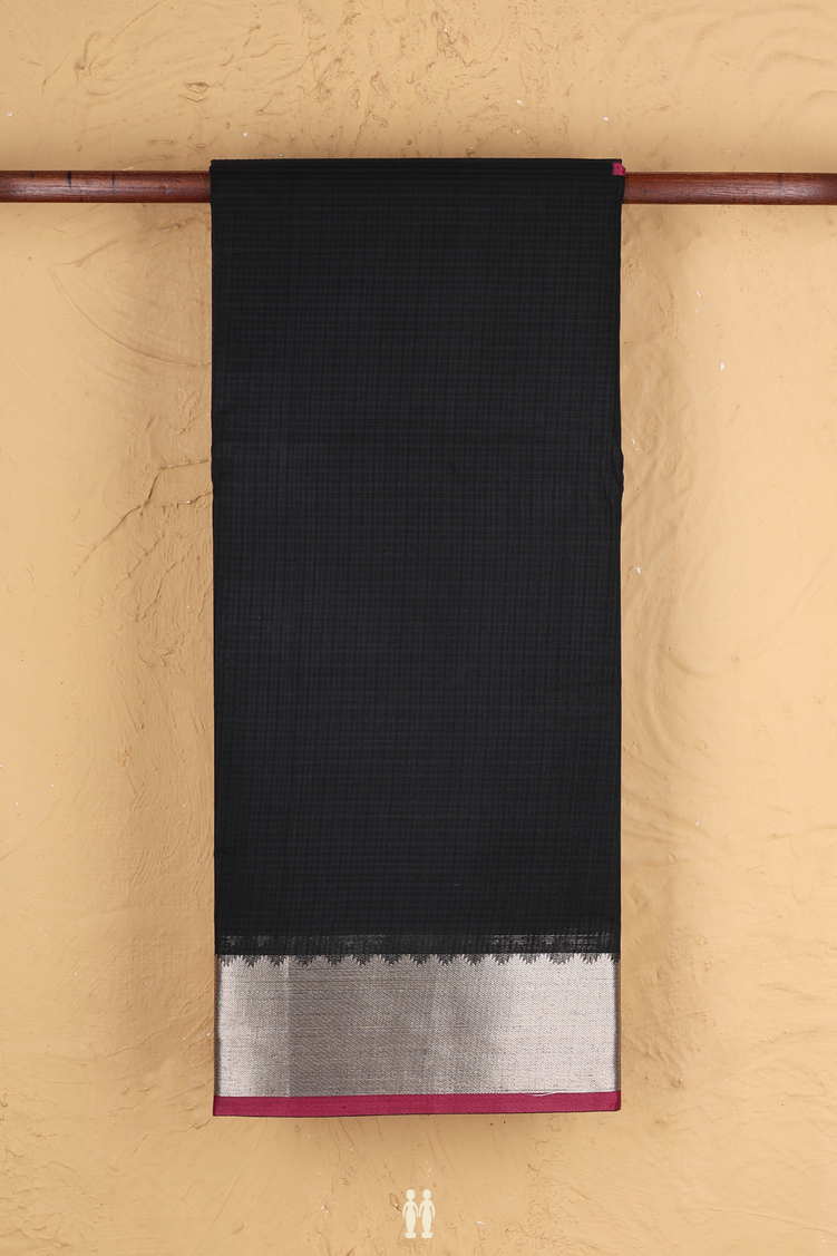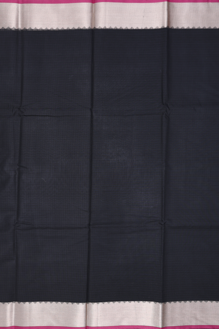 Elevate your ethnic wardrobe with this elegant kota cotton saree in deep black, enhanced by a delicate zari border completed by purple selvedge. Its lightweight, breathable fabric ensures comfort throughout the day, while the subtle shimmer of the zari adds a refined touch of sophistication. Perfect for both formal occasions and festive celebrations, this saree combines traditional craftsmanship with timeless style.