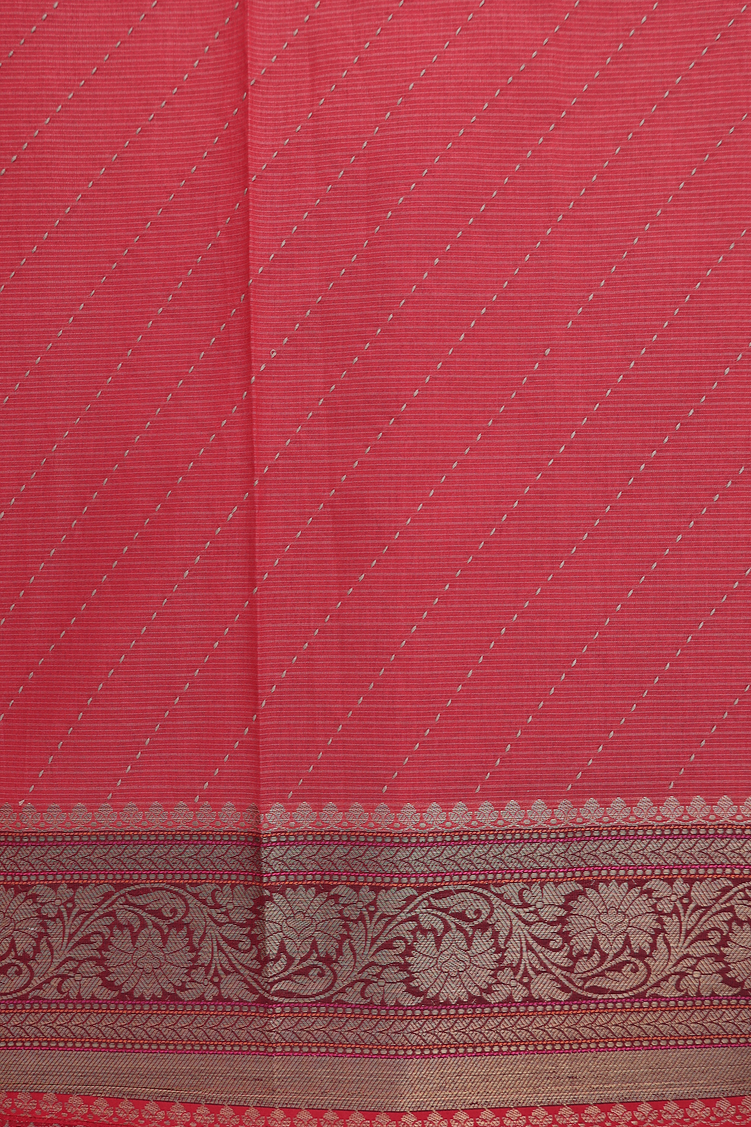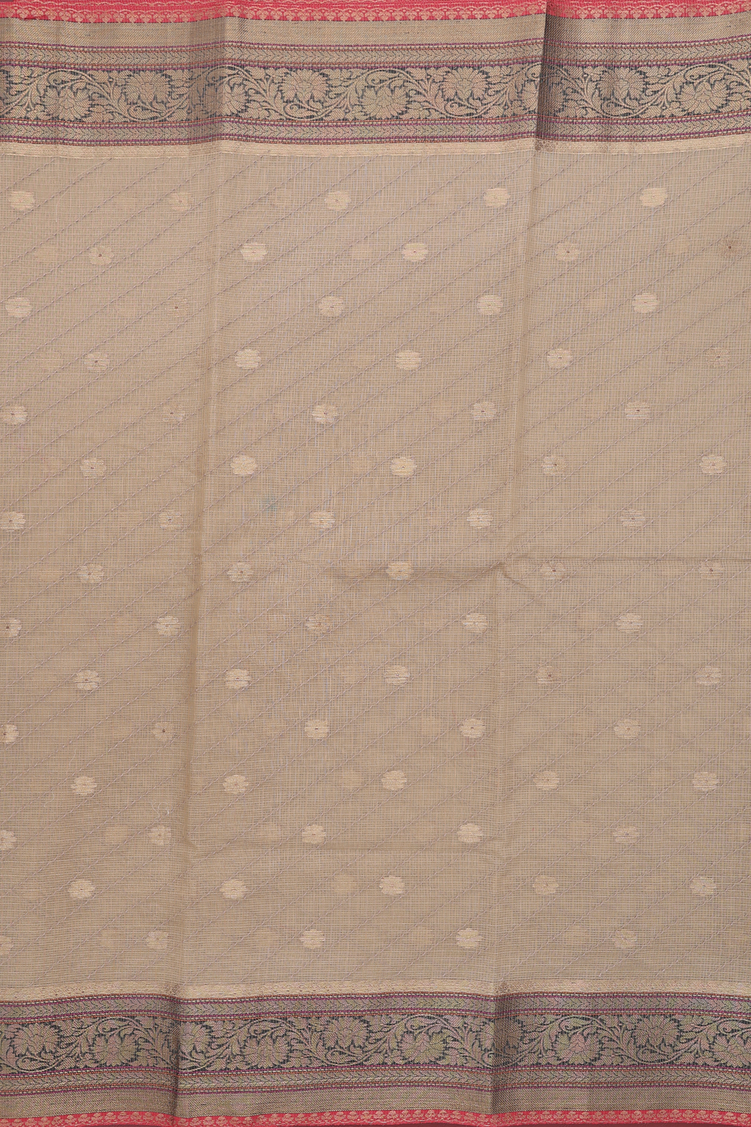 Experience elegance with this kota cotton saree in a subtle pastel brown shade, distinguished by its graceful diagonal design zari border completed by red selvedge. Lightweight and breathable, it offers comfort ideal for warm days, while the refined patterns add a touch of sophistication to your attire. Perfect for both casual wear and special occasions, this saree blends traditional craftsmanship with understated style.