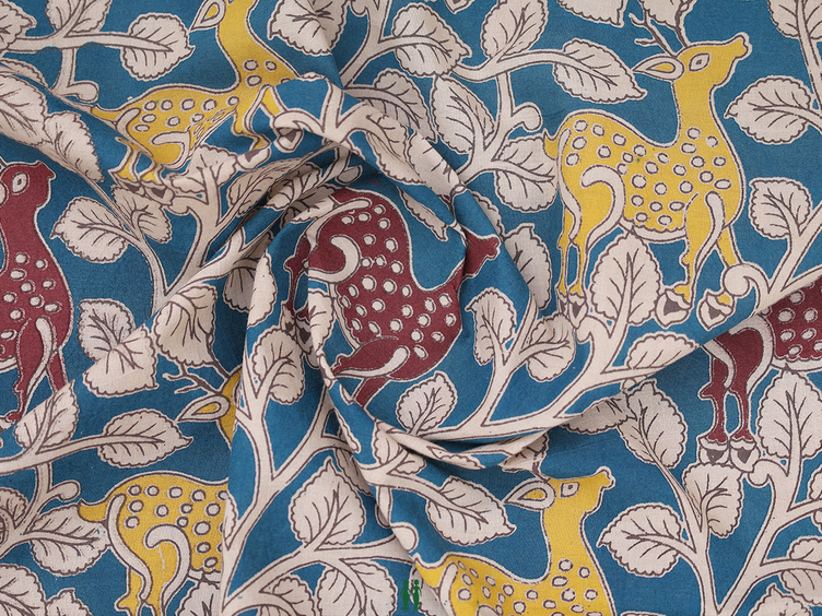 Elevate your blouse collection with this exquisite Kalamkari cotton material in serene teal blue. Featuring intricate leaf designs printed using traditional Kalamkari techniques, this fabric offers authentic artisanal craftsmanship. The soft cotton composition ensures comfort and breathability, making it ideal for creating elegant blouses. Perfect for both everyday wear and special occasions, this versatile material brings timeless Indian textile heritage to your wardrobe. Drape it beautifully and celebrate the artistry of traditional block printing.